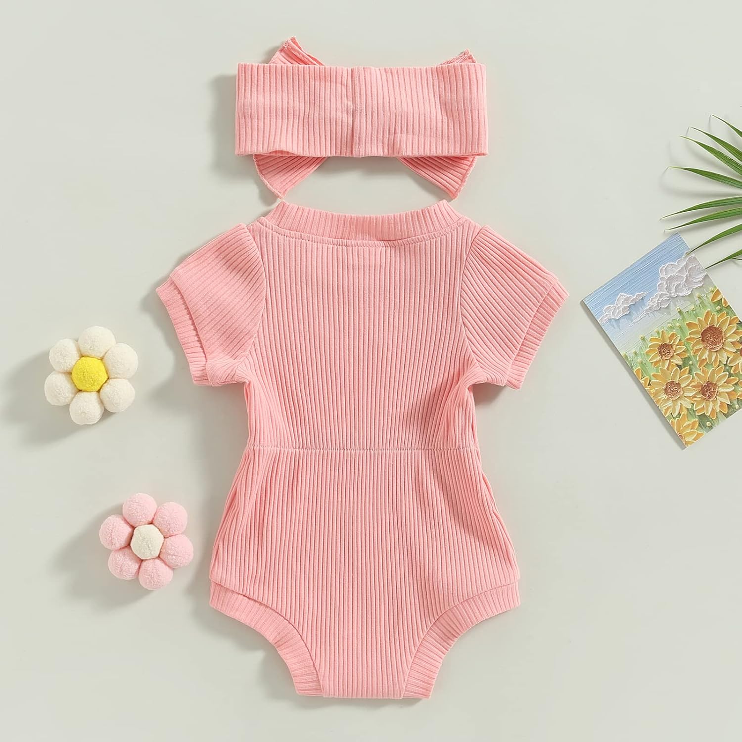 Newborn Baby Girl Clothes Solid Ribbed Short Sleeve Romper Jumpsuit Bodysuit with Headband Summer Outfit