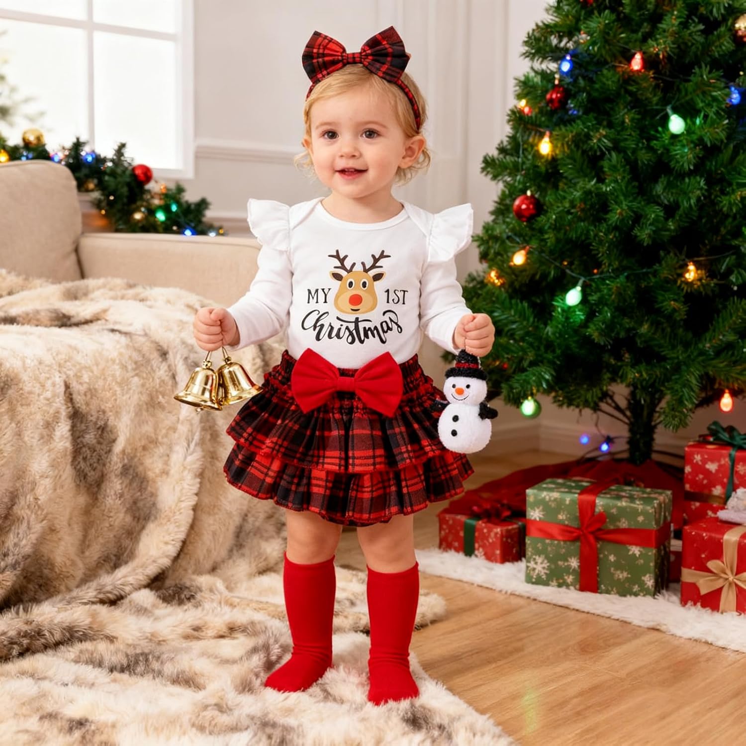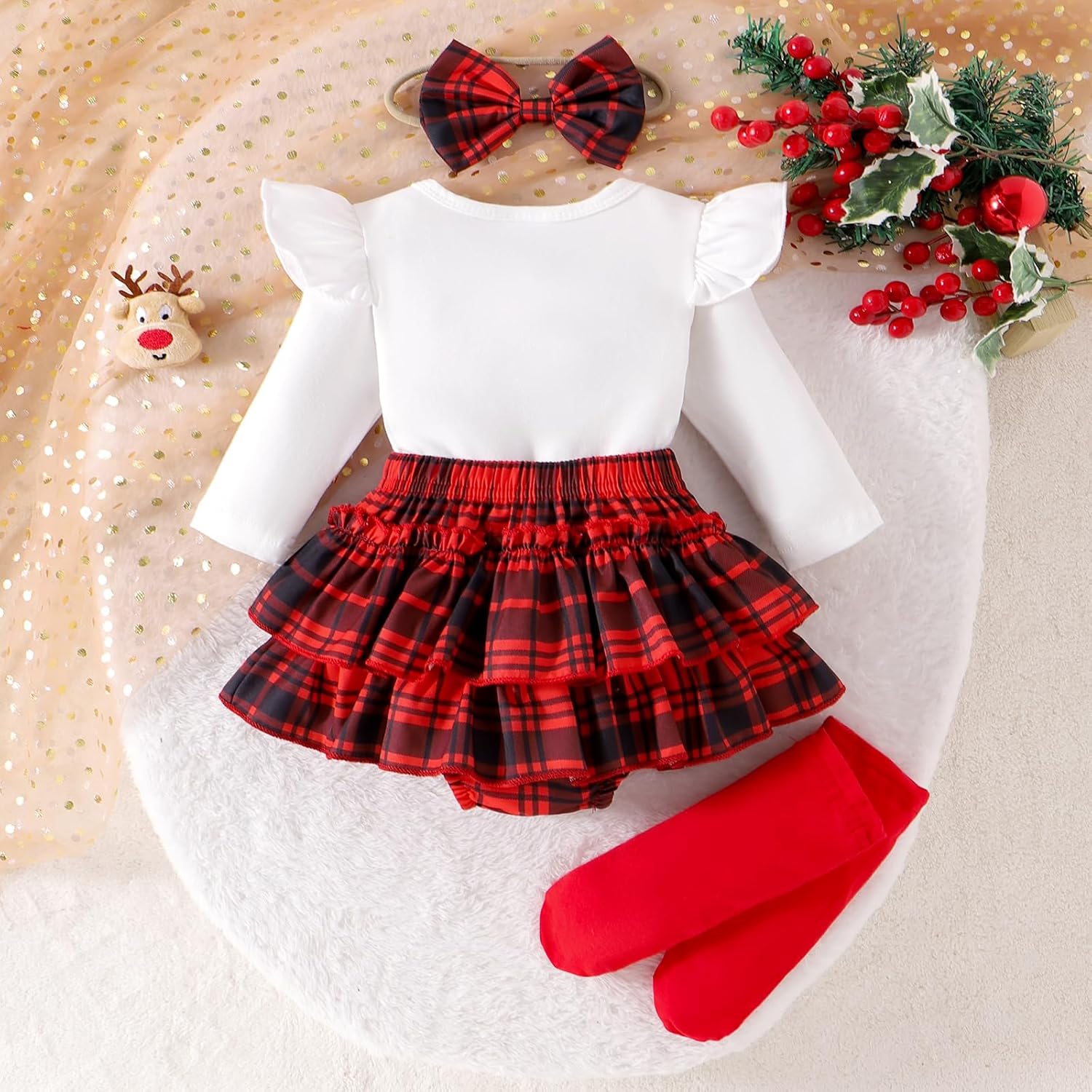 Christmas New child Child Lady Garments 4Pcs Toddler Lengthy Sleeve Romper Tutu Skirt Shorts Child Christmas Gown
