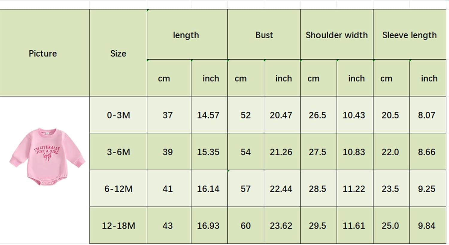 3-6M Size: 15.35 Bust: 22.05 Sleeve: 7.87 Shoulder: 11.81 Hip: 23.62 Recommend Age: 3-6 Months