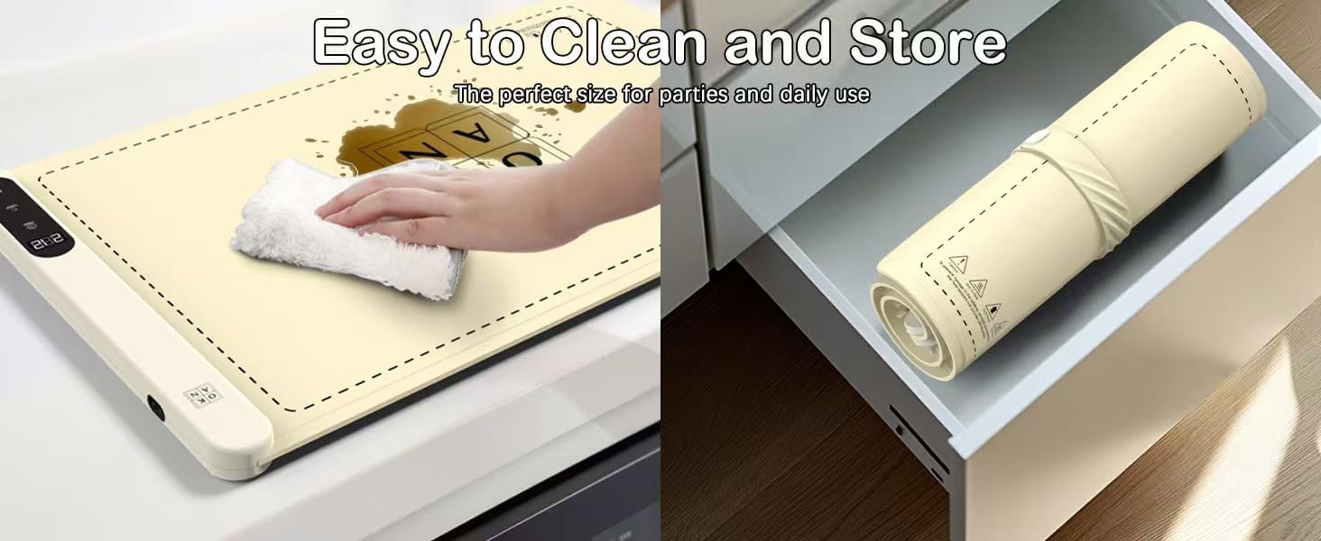 💧 Foldable, Waterproof & Straightforward to Clear – Sturdy silicone materials resists oil and water, making cleanup easy. Rolls up simply for storage or journey.