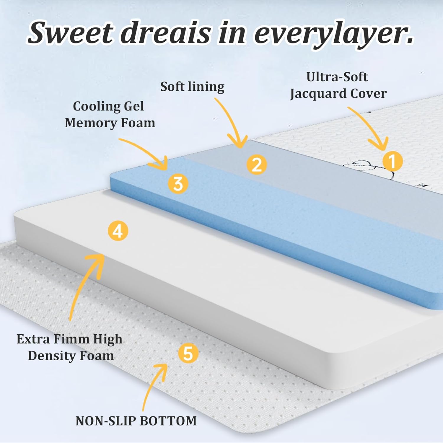 Sleep in Consolation – The softer facet is made from cooling gel reminiscence foam, which mixes the benefits of reminiscence foam and gel. It conforms to your toddler’s physique for even help and stress distribution, whereas the tender and cooling gel foam ensures consolation to your toddler to take pleasure in stress-free sleep and playtime.