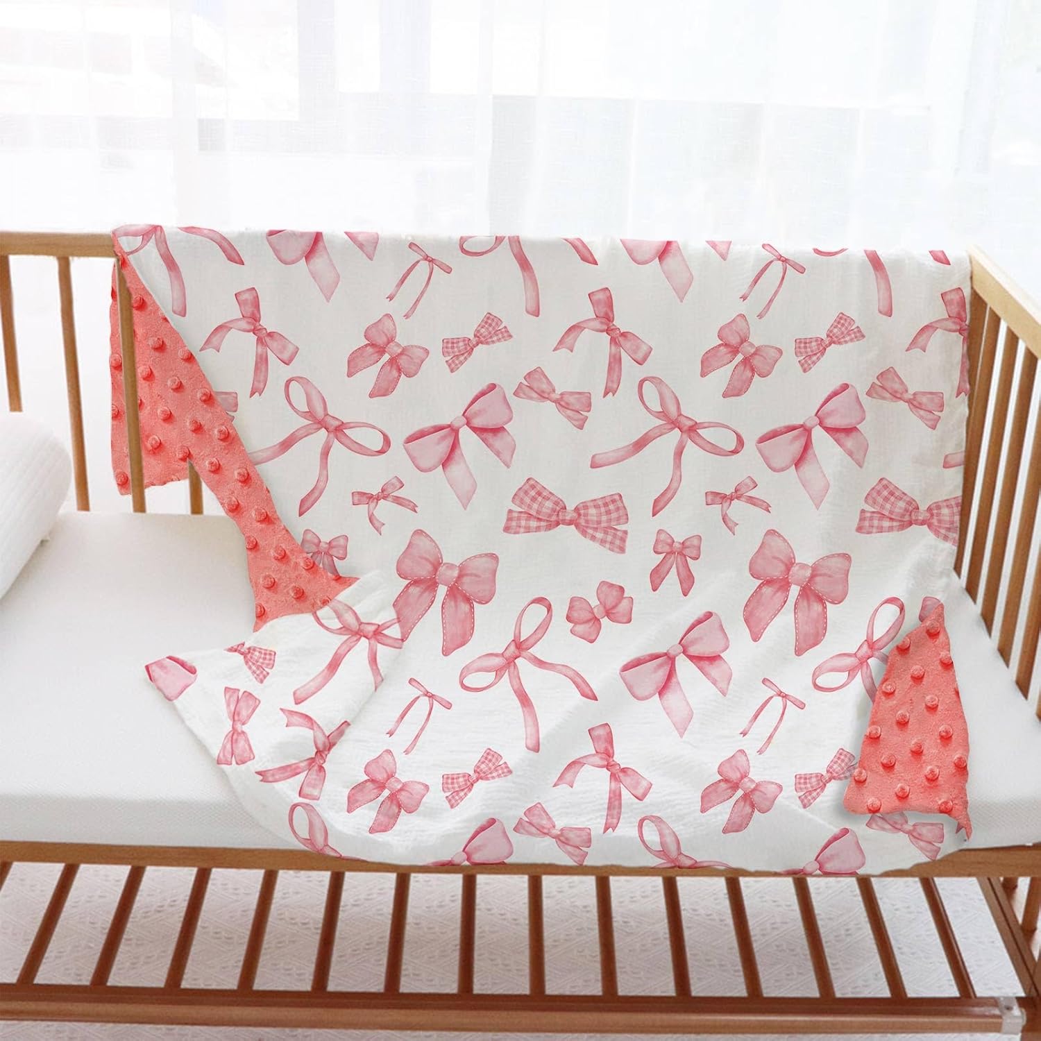 Pink Bow Baby Blanket for Girls, Cute Bowknot Soft Double Layer Minky with Dotted Backing, for Infant Newborn Nursery Baby Crib Receiving Blanket Bows Newborn, 30″x40″
