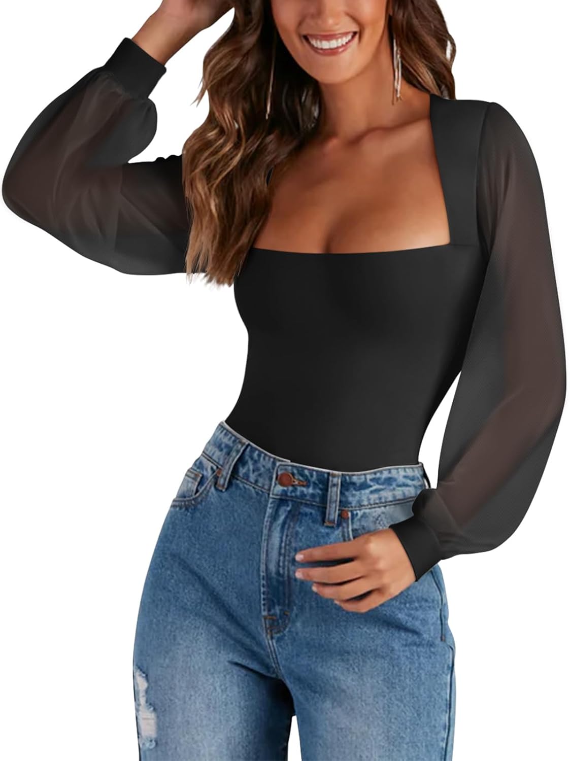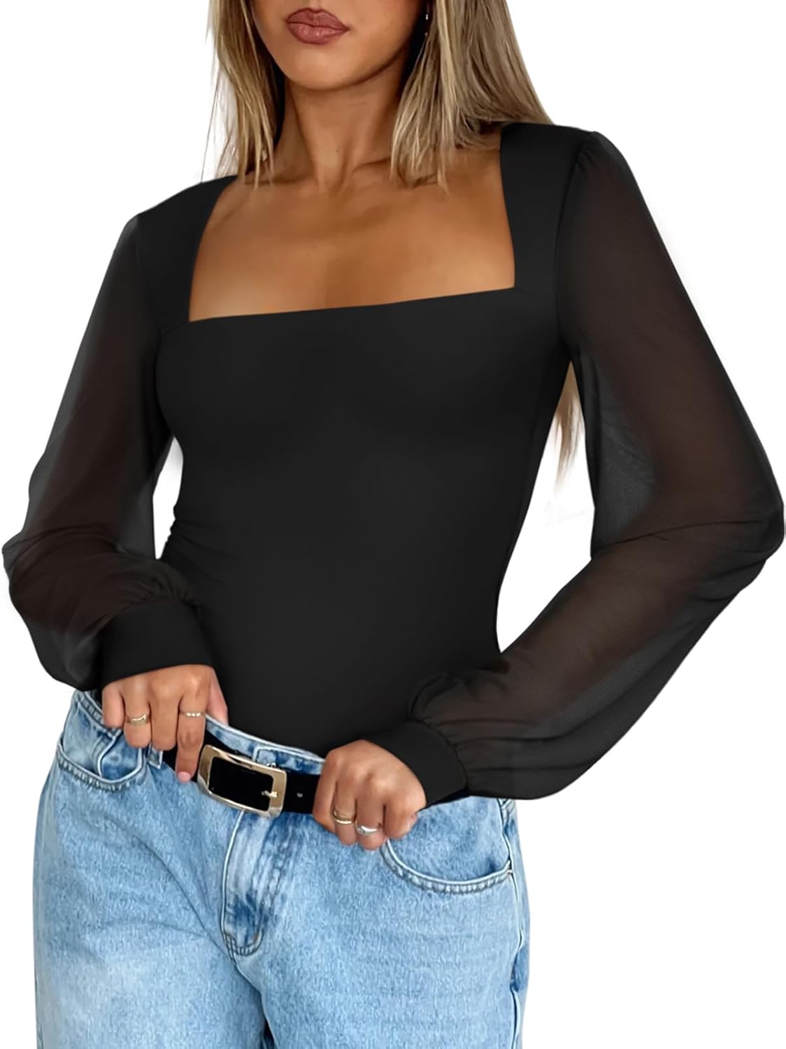 PINKMSTYLE Womens Sq. Neck Mesh Lengthy Sleeve Bodysuit Attractive Going Out Tops