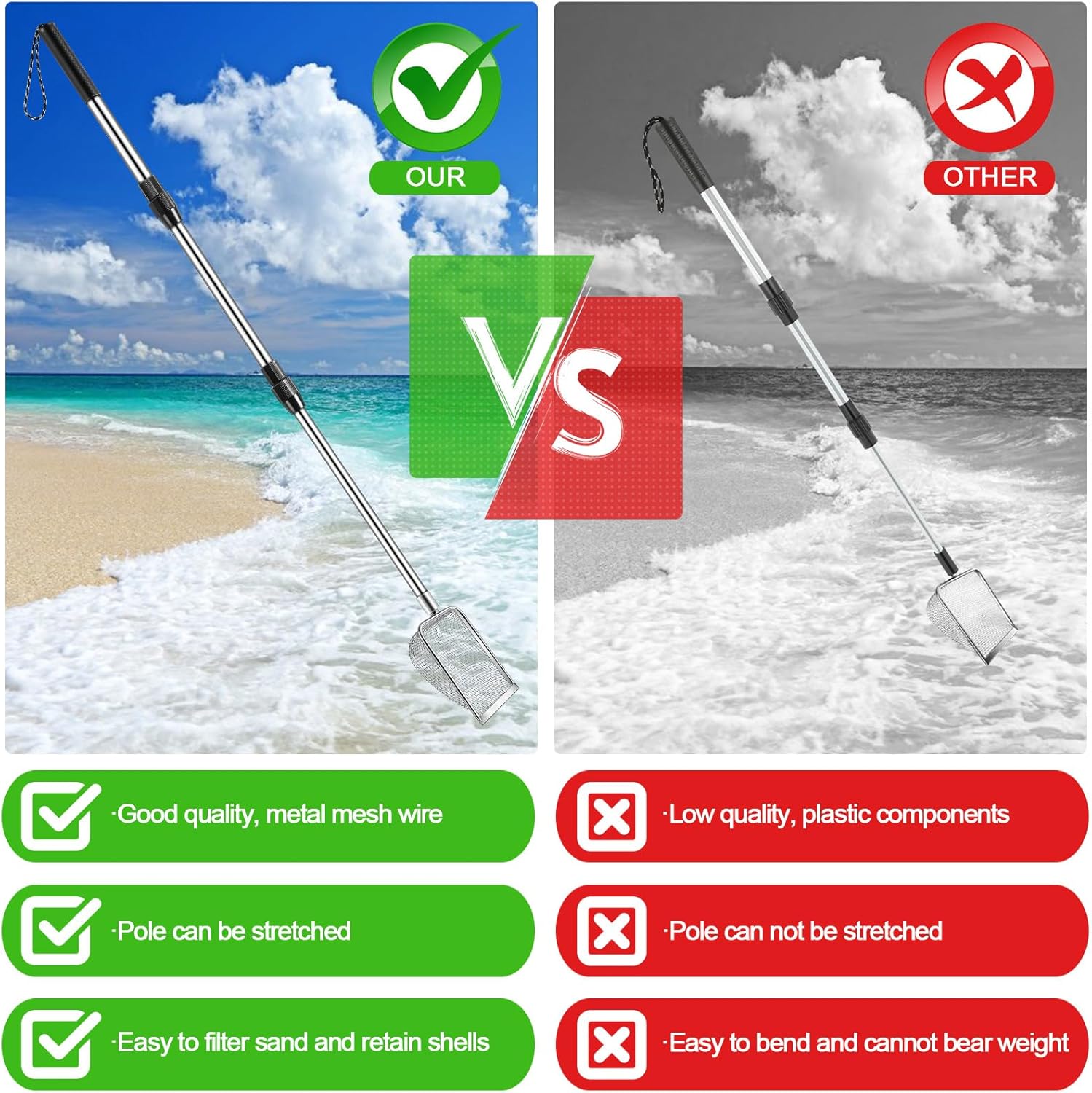 Extendable Longer Deal with: The seaside shell scoop can prolong from 33 inch to 42 inch, seaside sand filter shovel 6 inch, sufficient size permitting you to keep away from again ache and cut back again bending and stress. Designed for seaside gathering fans, when sand and water get in they fall out simply and yow will discover the shells and fossils hidden within the sand simply. Designed fastidiously to offer additional house for you. Seashore baggage are made from each waterproof material and mesh material. If sand and water enter, they may fall out simply.