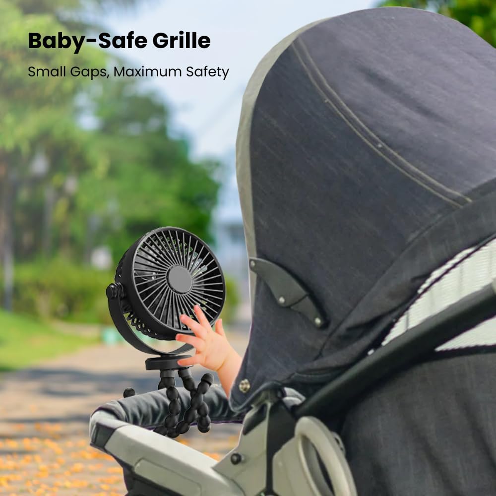 Portable Baby Stroller Mini Fan with Flexible Tripod, Rechargeable 360° Rotating Fan for Car Seat, Crib, Bike, Travel & Outdoor Use, Safe for Babies (Black)