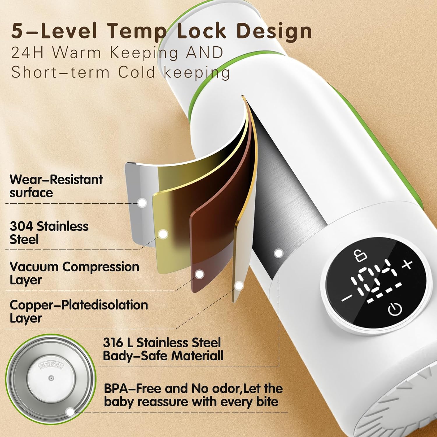 【Child-Secure & BPA-Free Materials】- Moveable child bottle hotter makes use of high-quality 316L chrome steel liner with out bpa and odor. Extra sturdy than 304 chrome steel. Make child feeding is safer, the mom extra comfortable. The 5cm massive diameter mouth of the bottle allow you to clear the liner simpler with none blind spots. Thickened sealed silicone ring within the mouth of the bottle can strengthen warmth preservation impact and stop water leakage