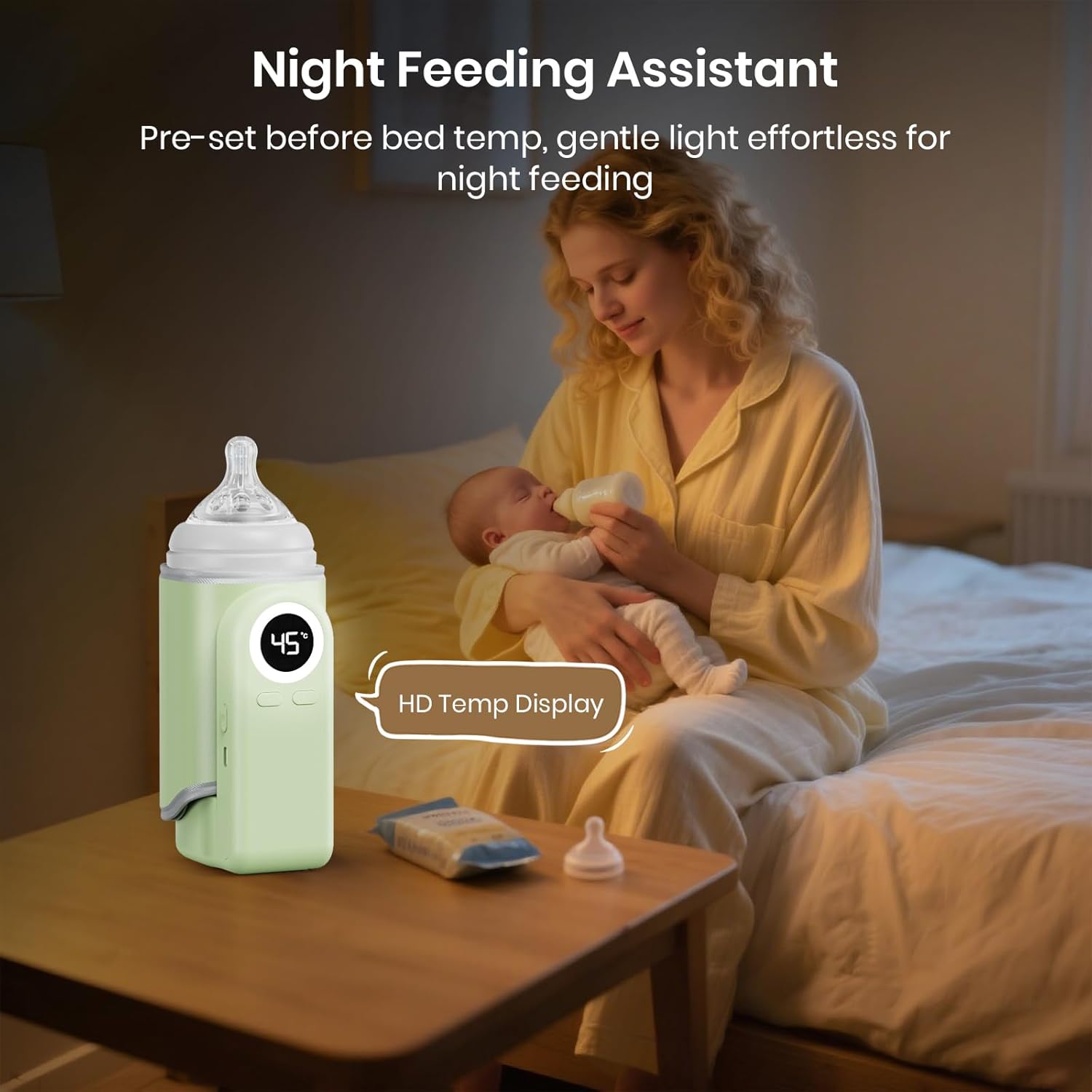 NIGHT FEEDING BOTTLE WARMER:Constructed-in Delicate-glowing evening mild helps you to feed with out blinding lights,preset temperature earlier than sleep,retains milk heat whereas charging,Excellent for evening hungry and crying child at any time