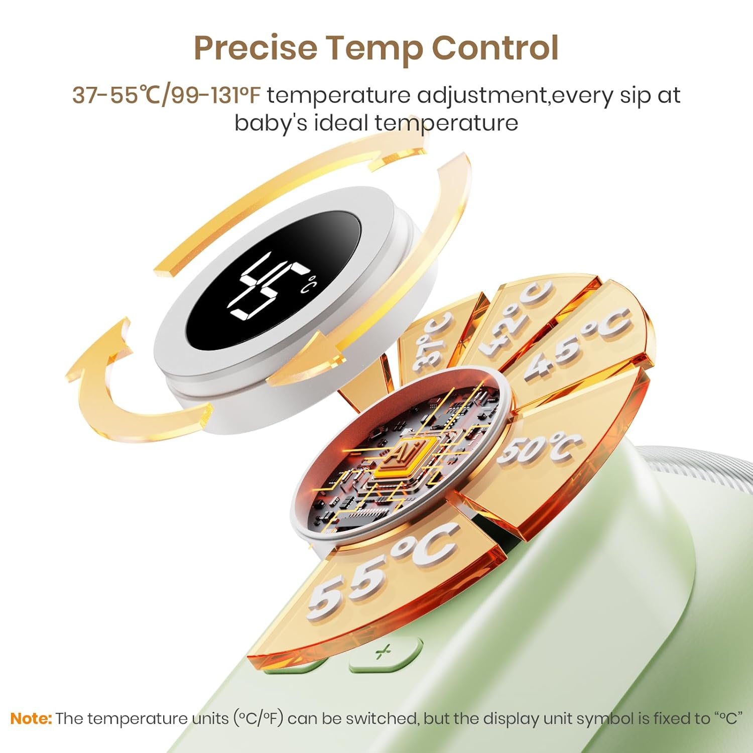 ONE-BUTTON BOTTLE WARMER:Celsius/Fahrenheit clever twin mode,meet all person habits. Be aware: “°C” image exhibits in all modes; in Fahrenheit mode, it = °F (e.g, 99°C = 99°F) The precise unit that means will depend on the chosen mode