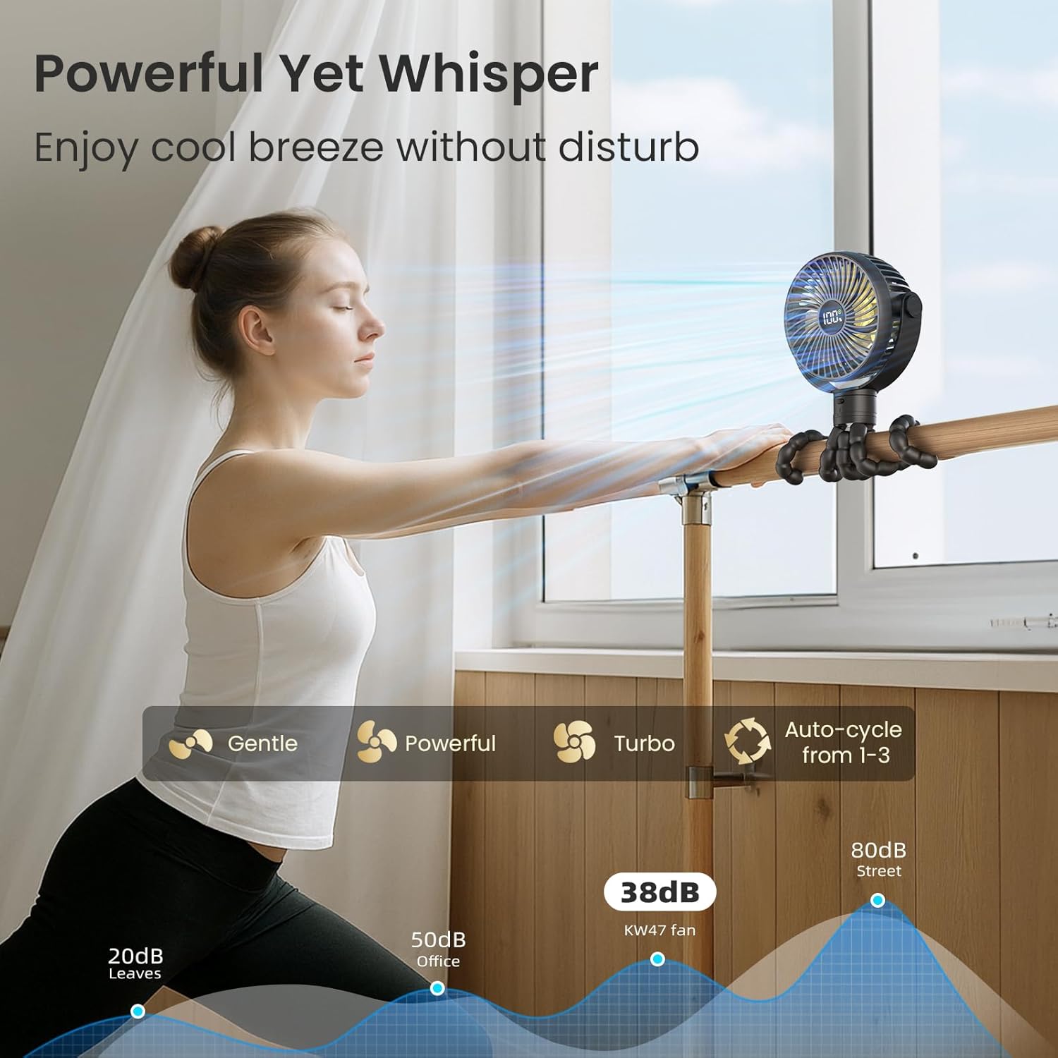 Highly effective But Whisper Quiet: The KW47 moveable fan has 4 speeds adjustable from Light (1) →Highly effective (2)→Turbo (3) , the 4th degree Auto cycle from 1-3. Brushless motor delivers highly effective airflow whereas sustaining ultra-quiet operation (≤38dB), child naps soundly with out disturbed.