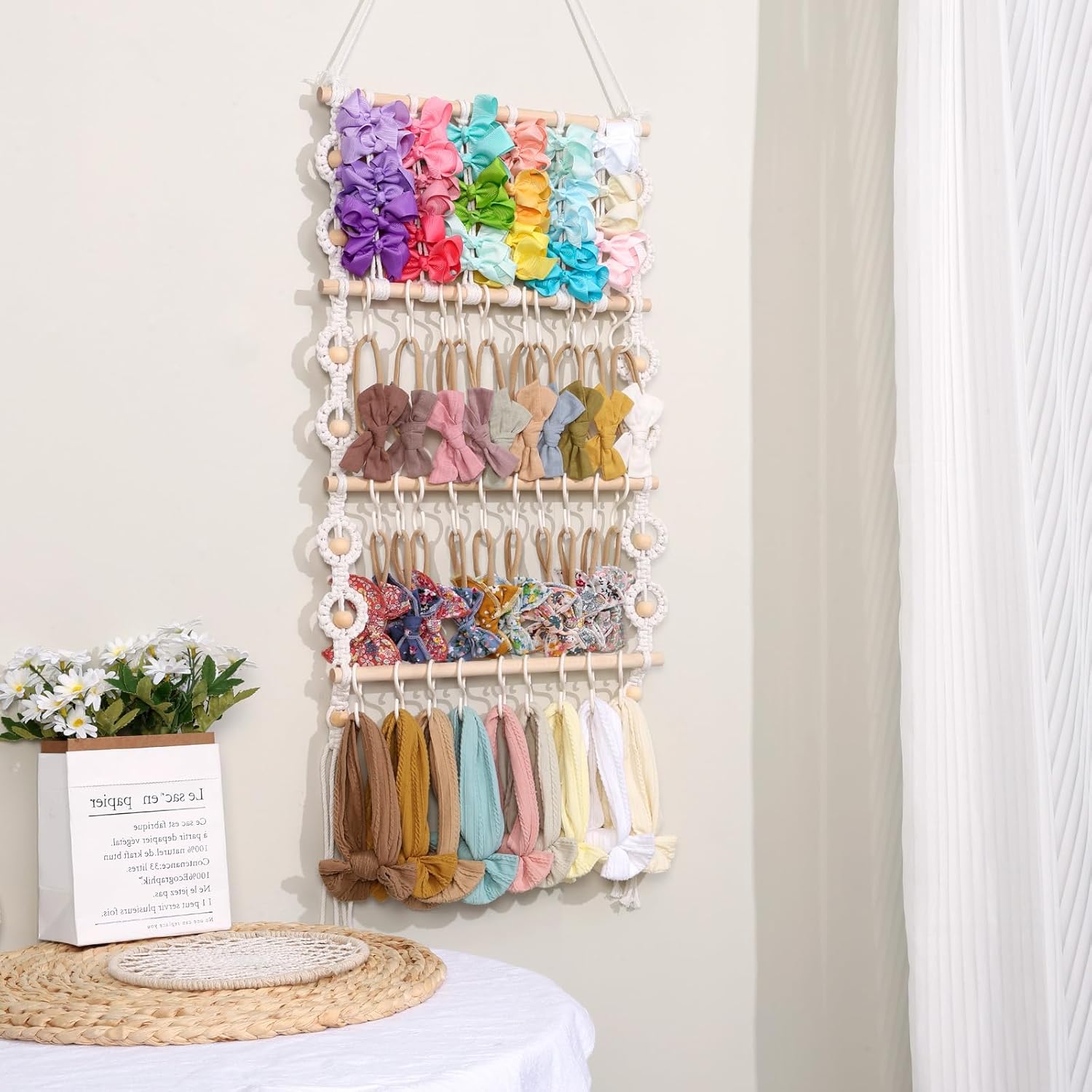 Bohemian Braid Model: The straps of the newborn bow organizer on either side are fabricated from delicate spherical loops woven by cotton and hemp rope. The general storage rack is fabricated from impartial colours and the ends are designed with tassels. Whereas displaying child hair equipment, the newborn lady bow organizer decorates the room of the newborn lady, making the room clear and delightful