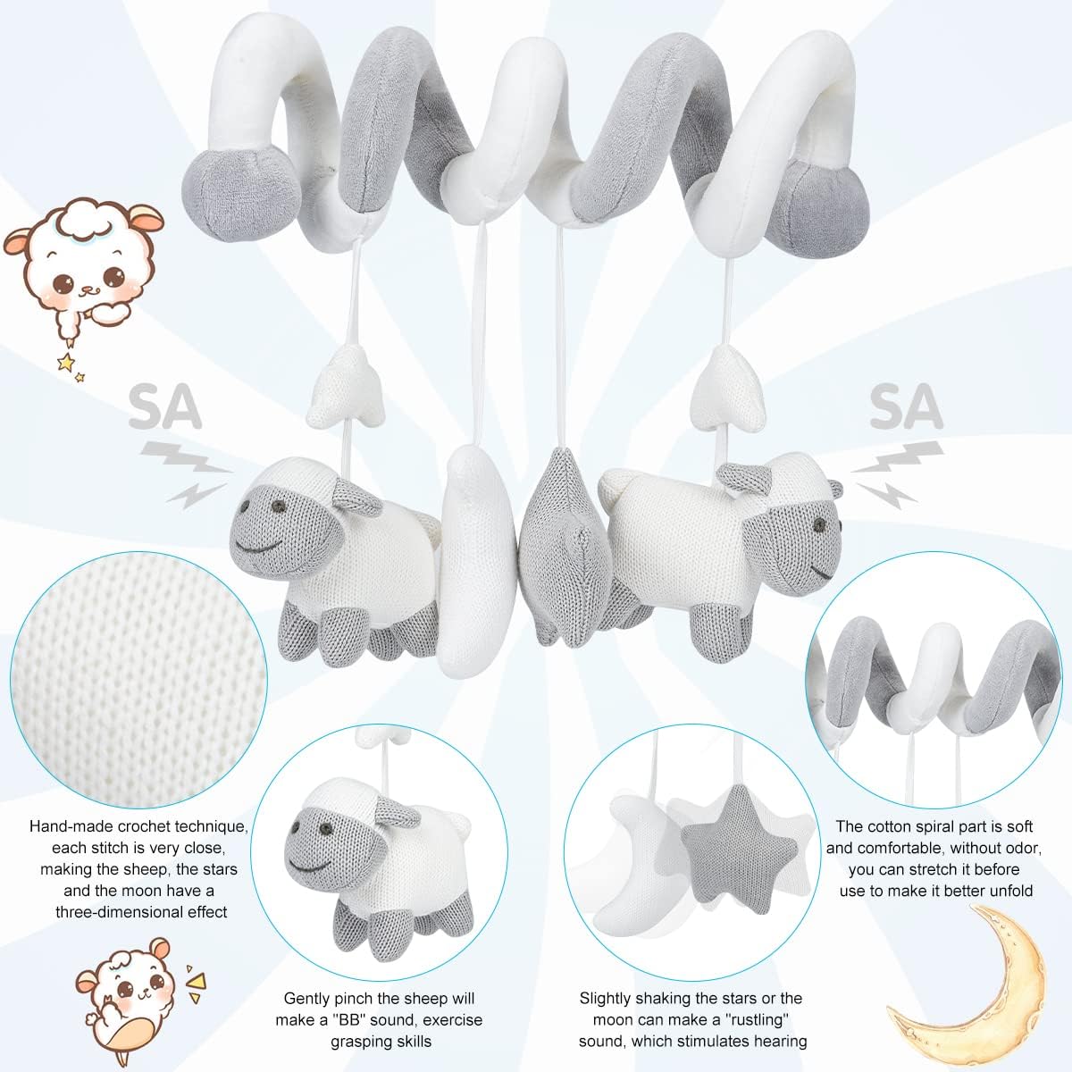 Sensation Expertise Growth – Spiral Automotive Seat Toys enable your child to tug, contact, and squeeze sheep, growing contact and hand-eye coordination, and train the newborn’s grasp potential,improve hand energy
