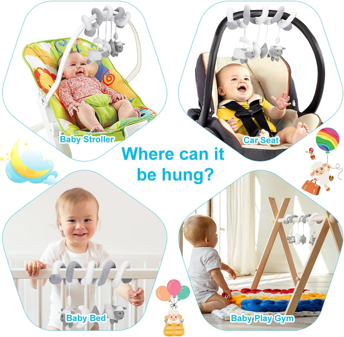 Elegant Shade & Distinctive Design – Stroller toys are available easy pastel colours that don’t injury the visible nerve whereas the newborn is growing imaginative and prescient. It is simple to spiral the hanging toy on automotive seat cellular, child provider, bassinet stroller bar, crib rails and purchasing cart handles and so forth