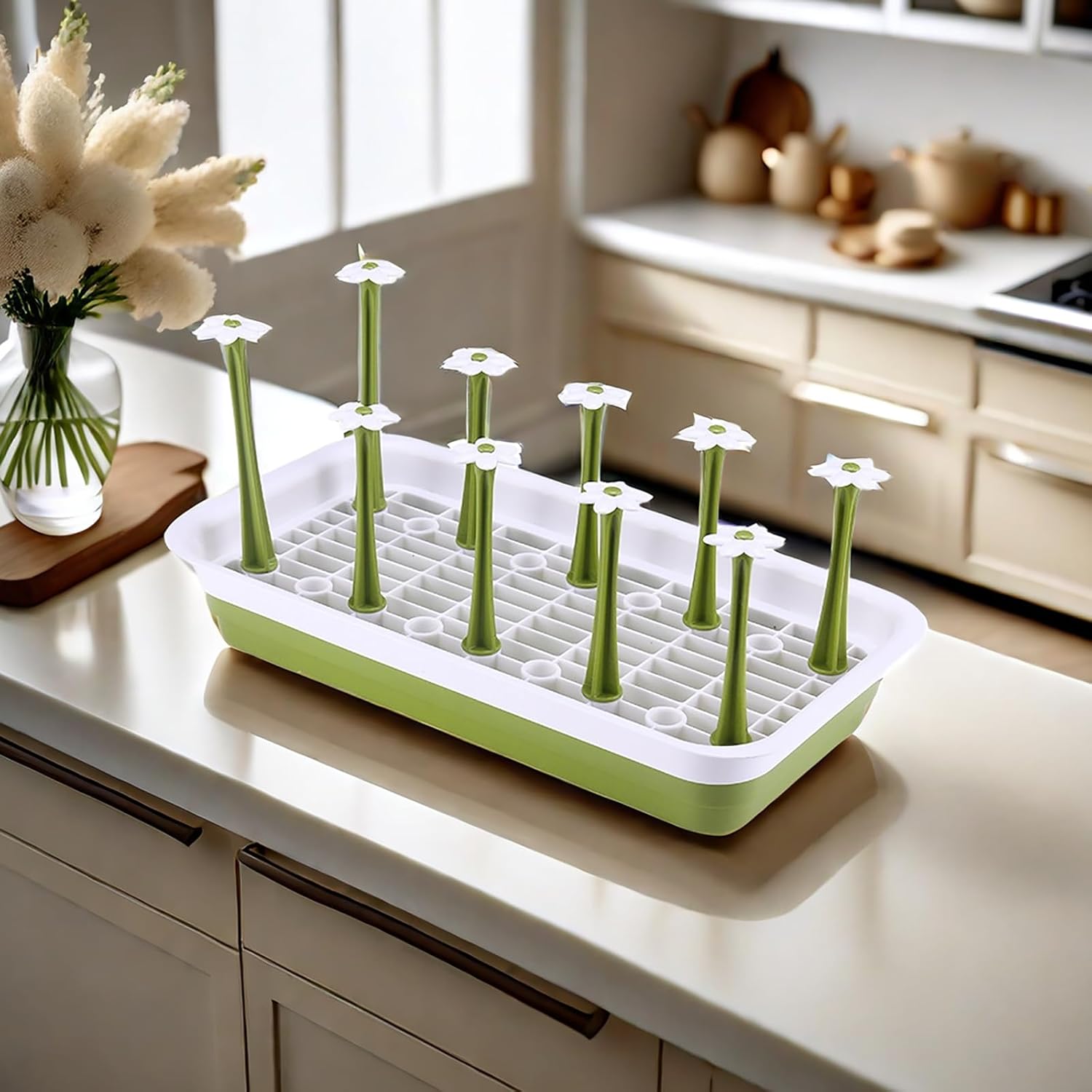 【Ergonomic Design】: This cup drying rack for the counter is removable, it comes with 10 rods of various heights to suit quite a lot of completely different sized bottles, the highest of the rods are fitted with flower formed silicone caps to forestall your bottles from scratching