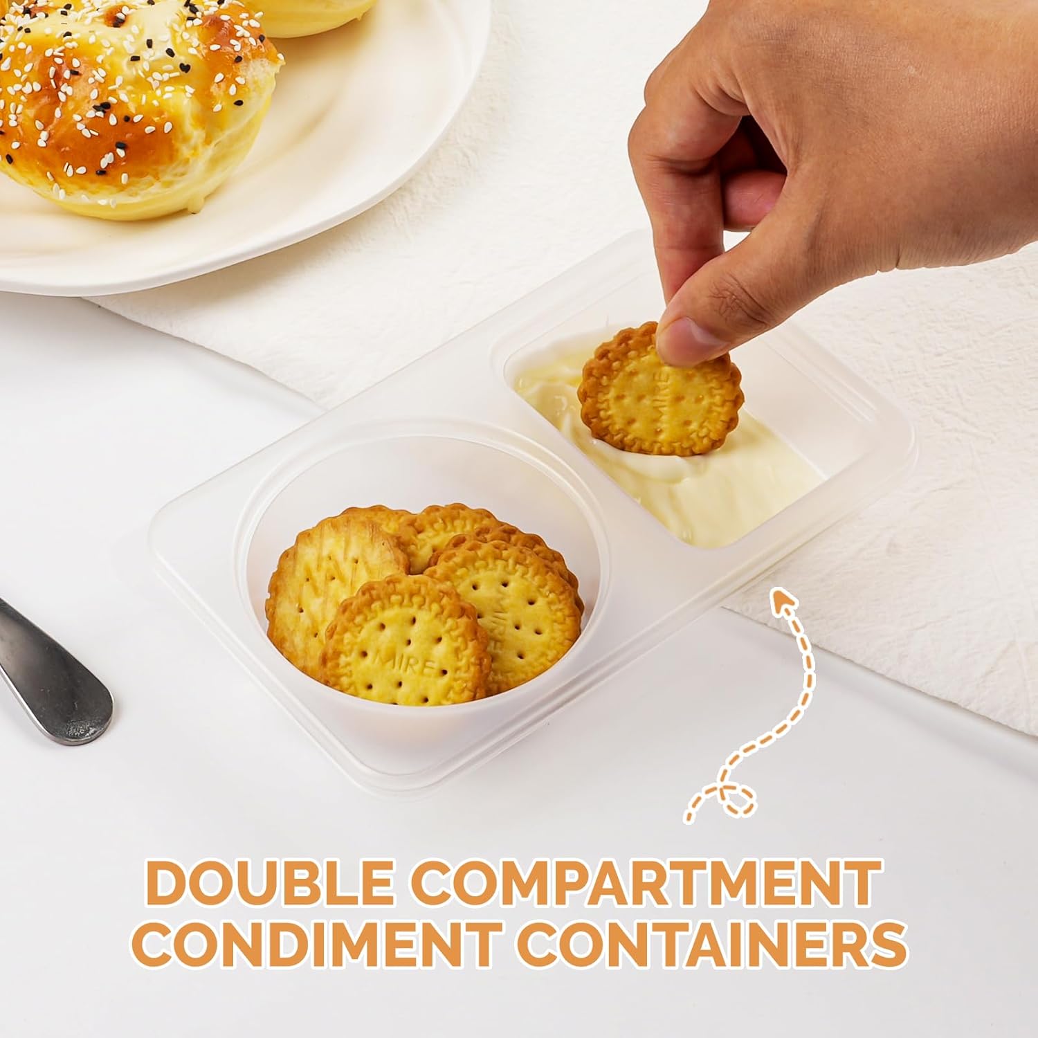 Double compartment sauce field: Every sauce field is designed with two impartial compartments, together with a 3-ounce spherical cup and a 3-ounce sq. cup. This design makes it handy so that you can retailer and carry completely different snacks, sauces or desserts to keep away from mixing them collectively.