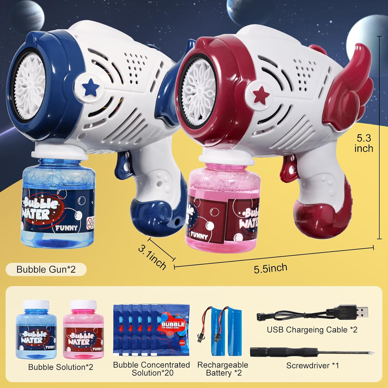 Tremendous Worth Bundle: Our bubble gun set Contains 2 pack bubble blaster, 2 bottle of bubble answer, 20 bag answer, a small screwdriver; All materials of the product has meet the U.S. toy and battery requirements