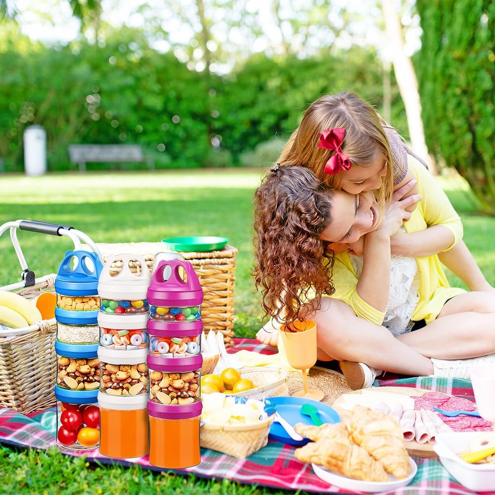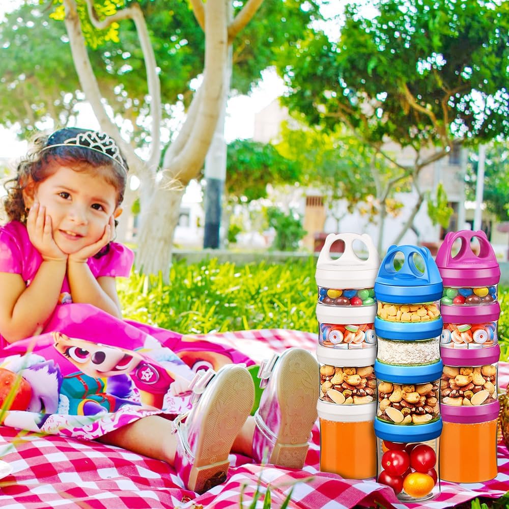 Stackable, interlocking containers for carrying Wholesome Snacks, Powder, Fruits and Drinks at dwelling or on the go.
