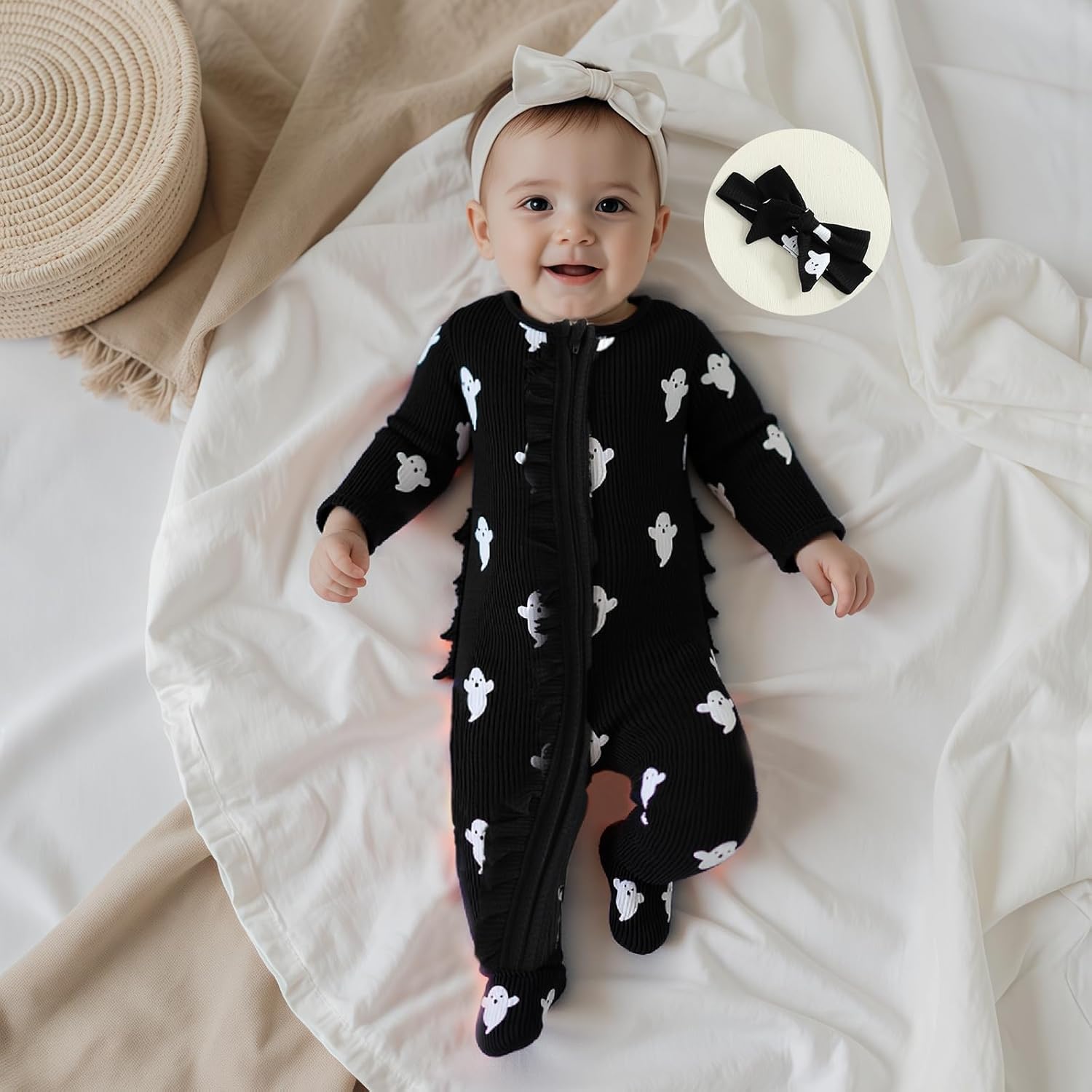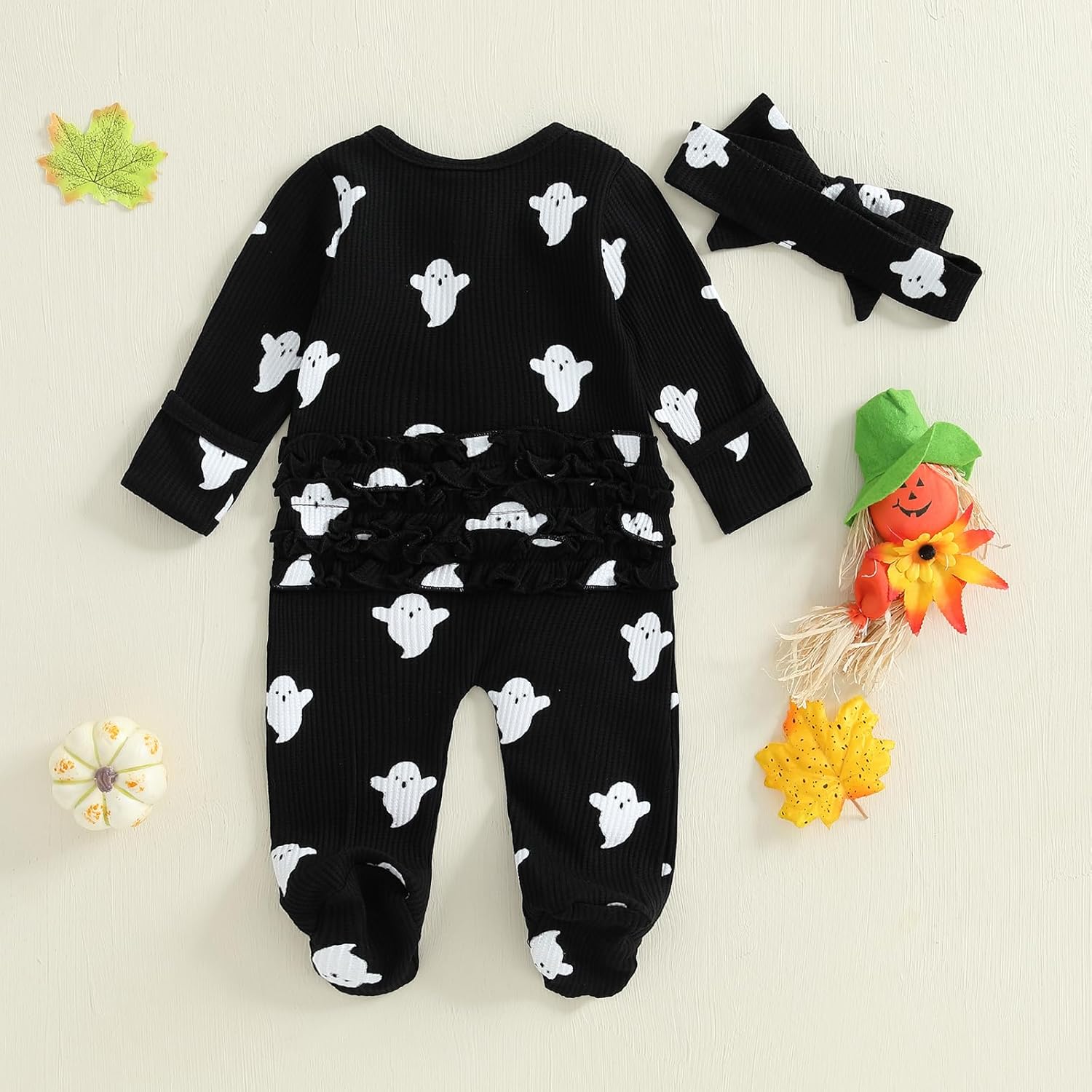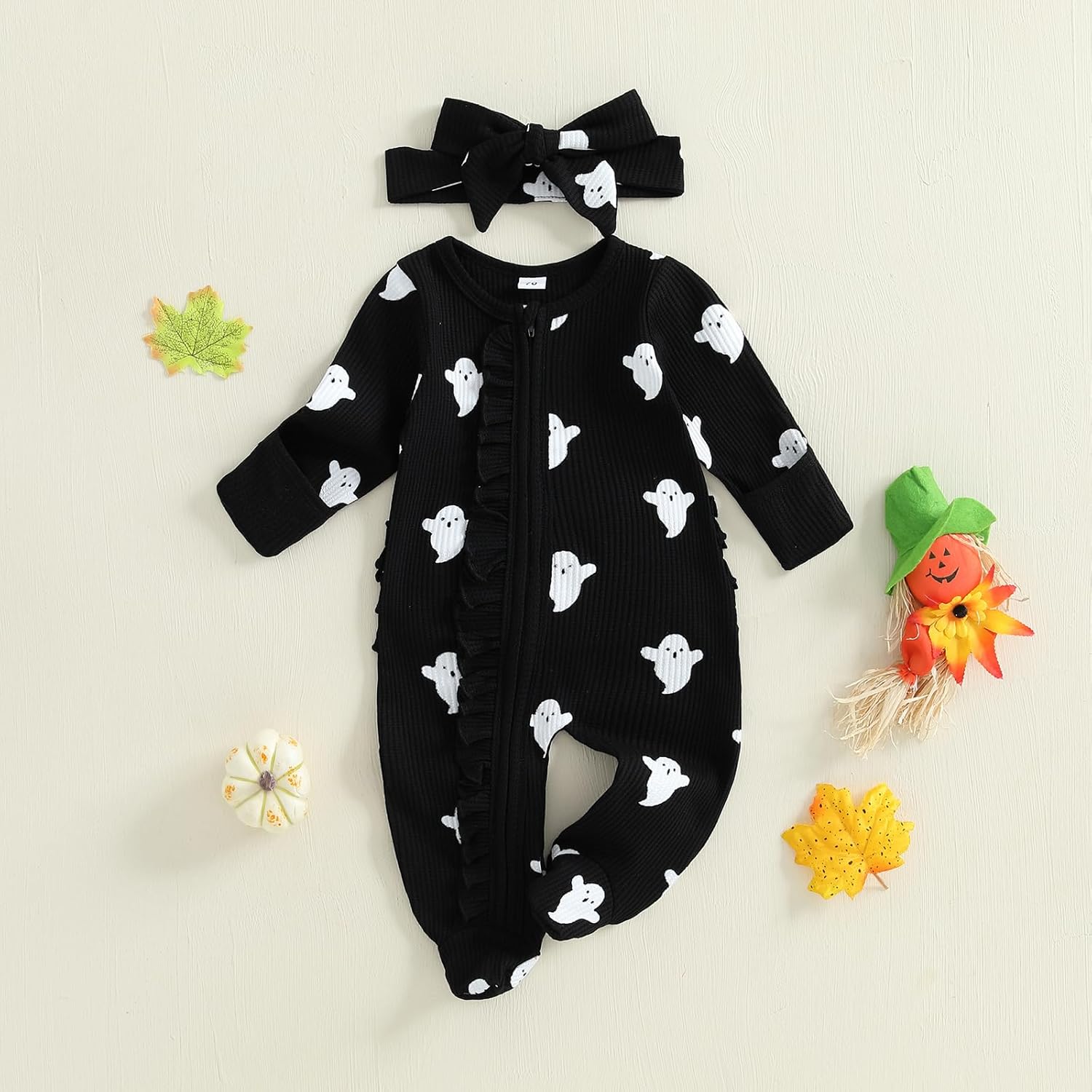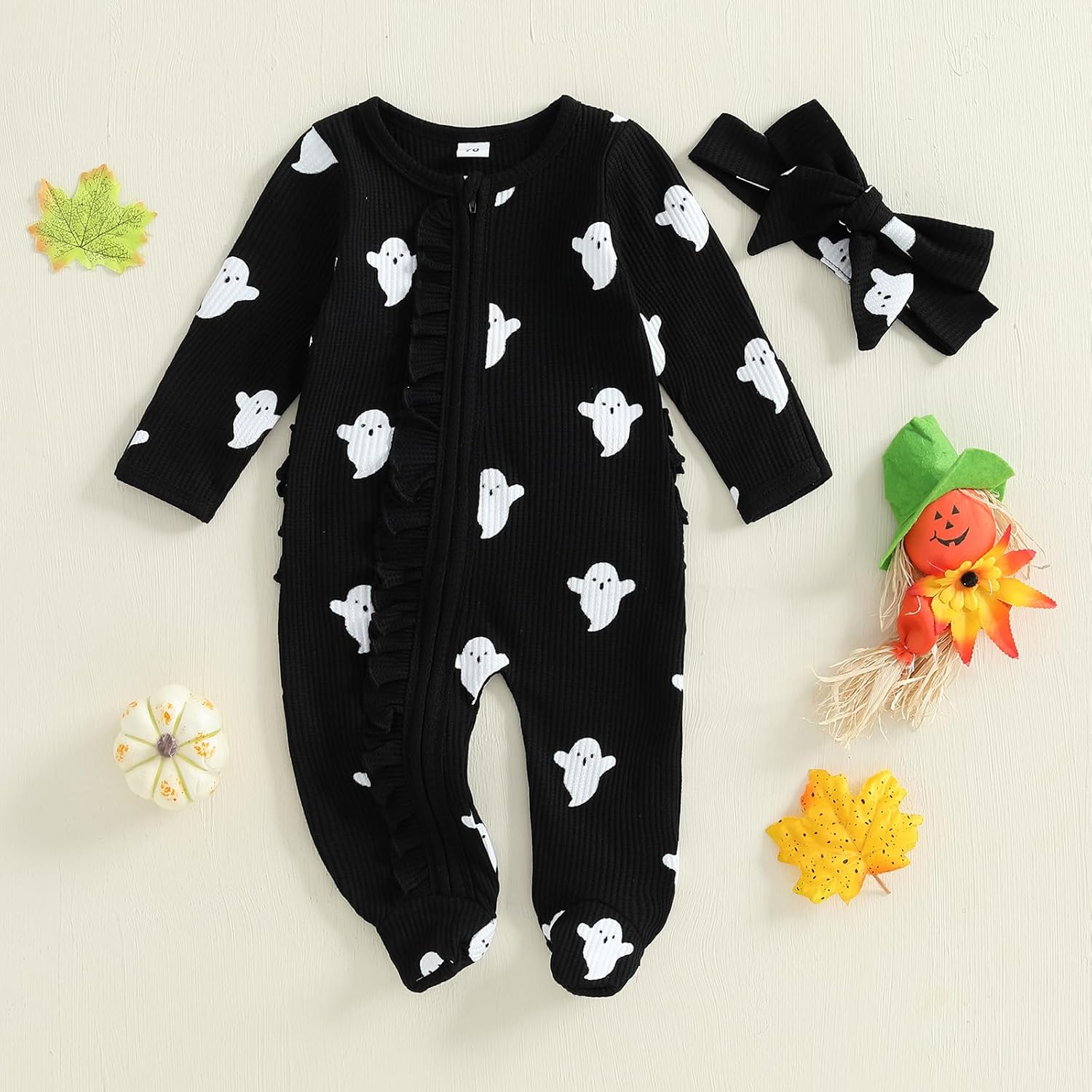 Halloween child garments; Toddler lengthy sleeve romper with ghost print, ruffle element, entrance zipper closure, lengthy sleeves, spherical neckline; And cute headband set, easy however modern, make your child extra lovable