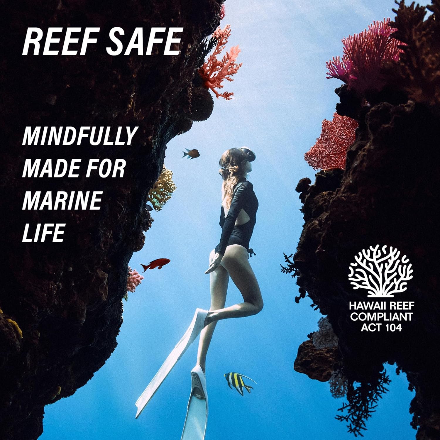 // NO BANNED INGREDIENTS // Ocean-safe and enviornmentally accountable. Hawaii Reef Compliant Act 104. Avoids chemical compounds banned in Hawaii, Key West, and U.S. Virgin Islands (no: Oxybenzone, Octinoxate, Avobenzone, Homosalate, Octocrylene). Reef-Secure. Forest-Secure. Mindfully made for marine life and the world round us.