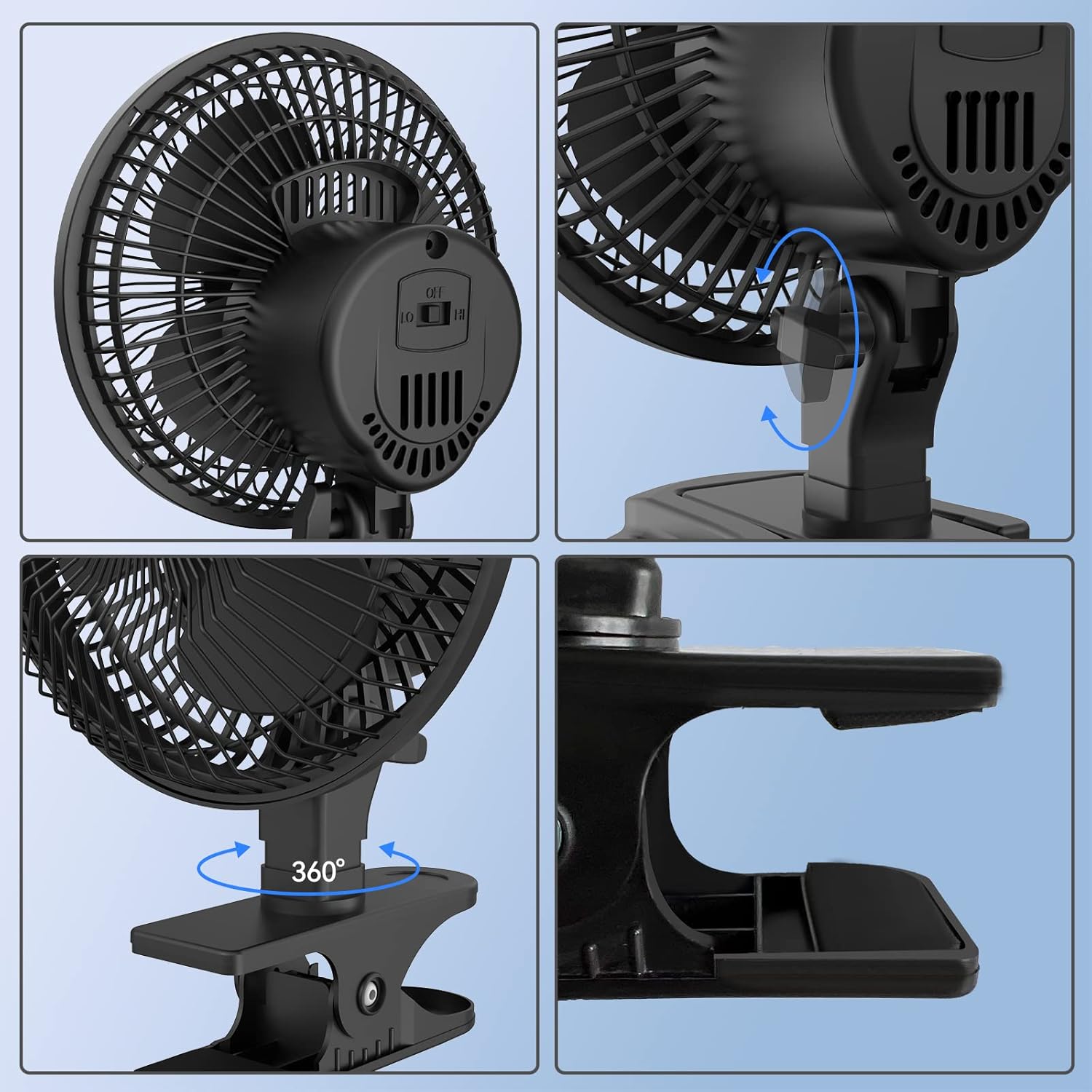2 Fan Speeds 360° Head Rotation Sturdy Clamp Quiet Operation Adjustable Tilt