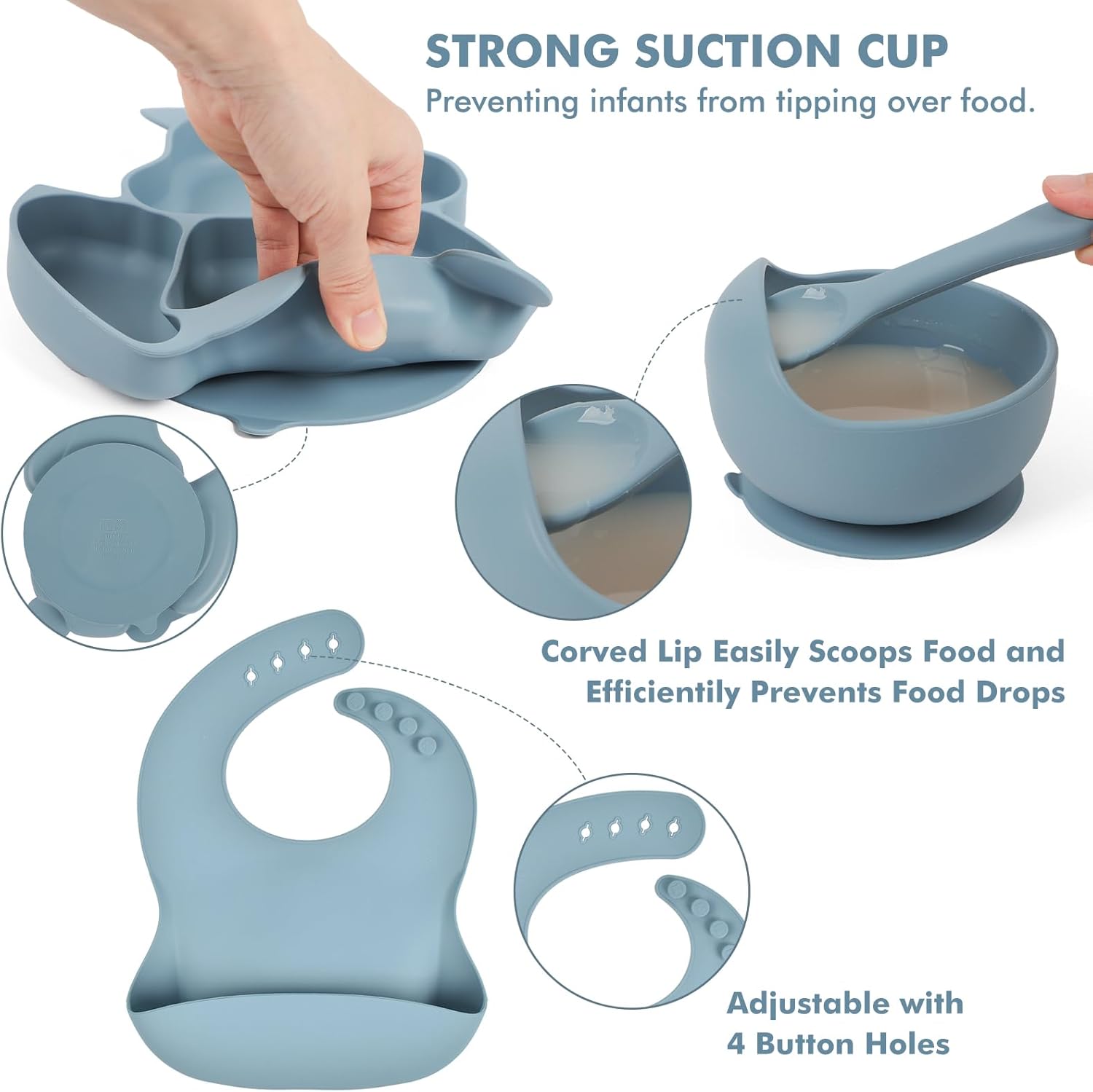 The bib is designed with 4-hole adjustable dimension, carrying it might probably keep away from garments getting soiled. Fabricated from full silicone with rounded edges to care to your child’s tender pores and skin.