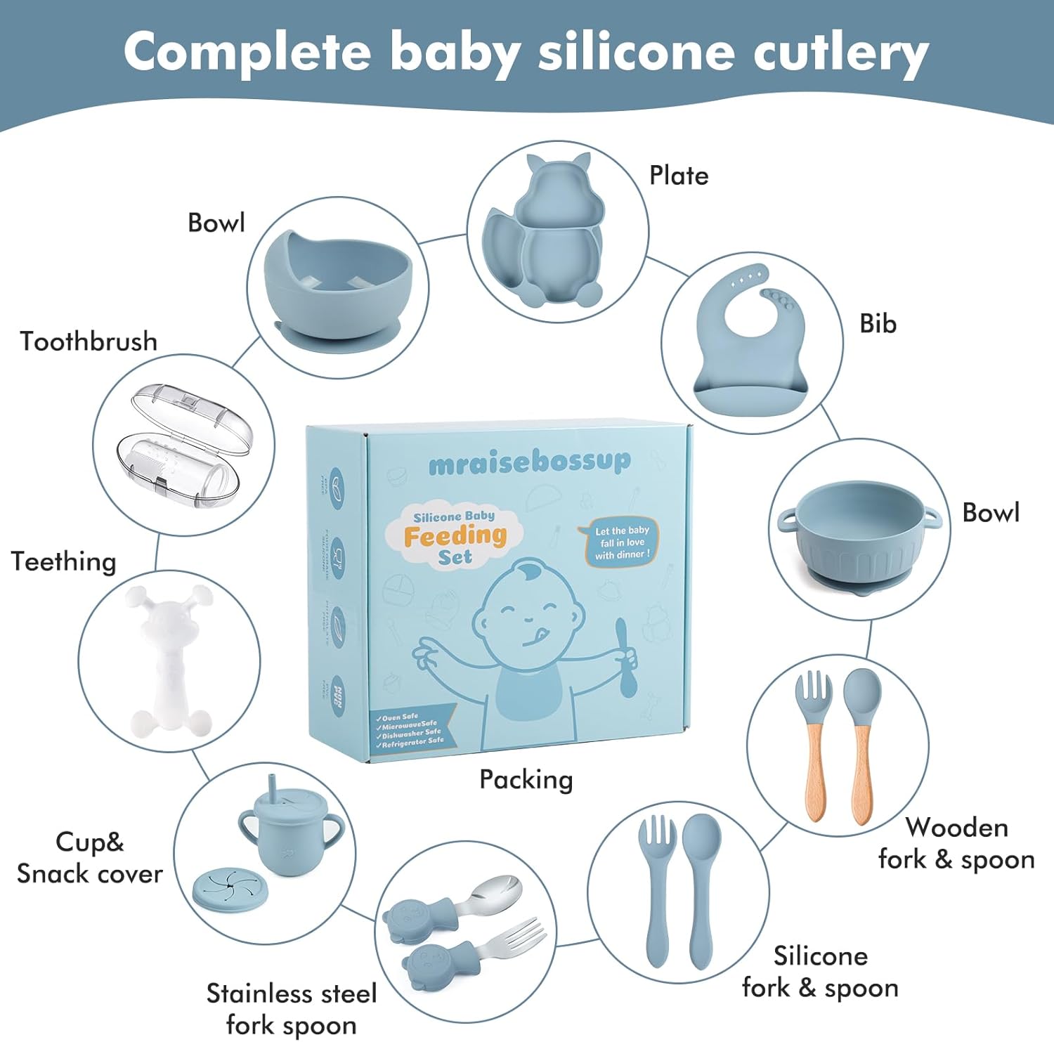 mraisebossup Child Silicone Tableware:It is a silicone cutlery set containing 15 items for infants and toddlers, right here is every part you want! Whenever you obtain and open this silicone tableware set, there could also be a slight silicone odor, please don’t fret, it’s meals grade silicone, protected and non-toxic, you possibly can take it out and place it in boiling water for a couple of minutes to dissipate. It could actually work correctly in temperatures from -40℃ to 240℃, BPA-free, PVC-free, all indicators are licensed by CPSC licensed third celebration in the USA to acquire the CPC certificates. This child silicone cutlery set is straightforward to wash, unusual stains will be rinsed out with water, or put it within the dishwasher, please be happy to make use of it!