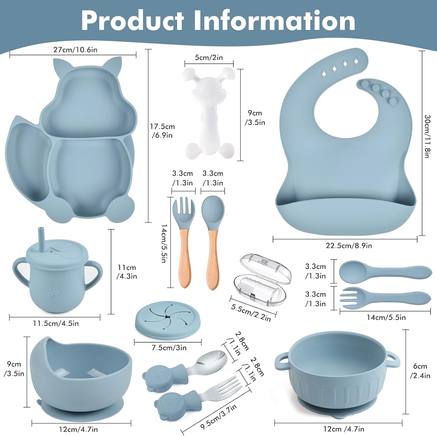 Silicone child feeding set,the right silicone tableware set for coaching your child to self-feed,an entire vary of tableware appropriate for feeding infants after weaning and for self-feeding toddlers,The feeding set accommodates a plate with suction cup and two bowls with suction cups, in addition to a coaching cup, bib, teether, finger brush and quite a lot of forks and spoons