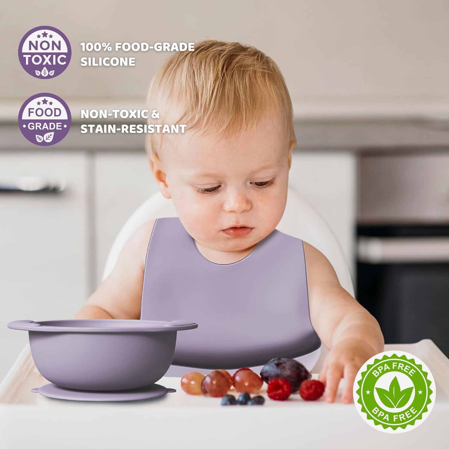 Silicone Baby Feeding Set, 9 Pcs, BPA-Free Baby & Toddler Feeding Kit with 2 Waterproof Bibs, Suction Plates & Bowls Set, Self-Feeding Baby Spoons, toddler plates for baby utensils 6-12 months, Purple