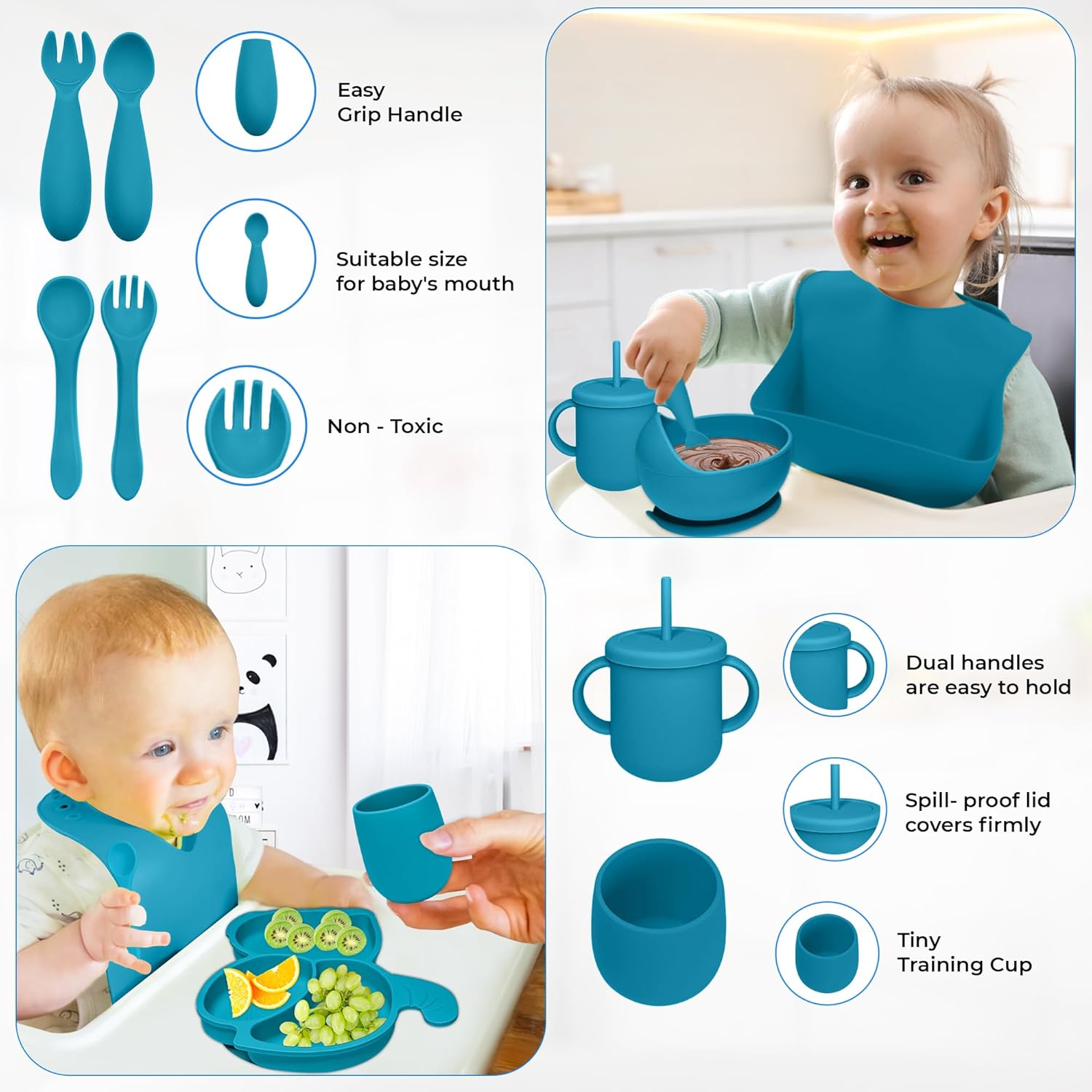 Begin Child Led Weaning: Our 9-piece feeding set consists of all of the necessities for introducing stable meals to your toddler. It consists of a divided suction plate, a suction bowl, a mug with handles and straw lid, a consuming cup, and units of enormous and small spoons and forks for self-feeding coaching.