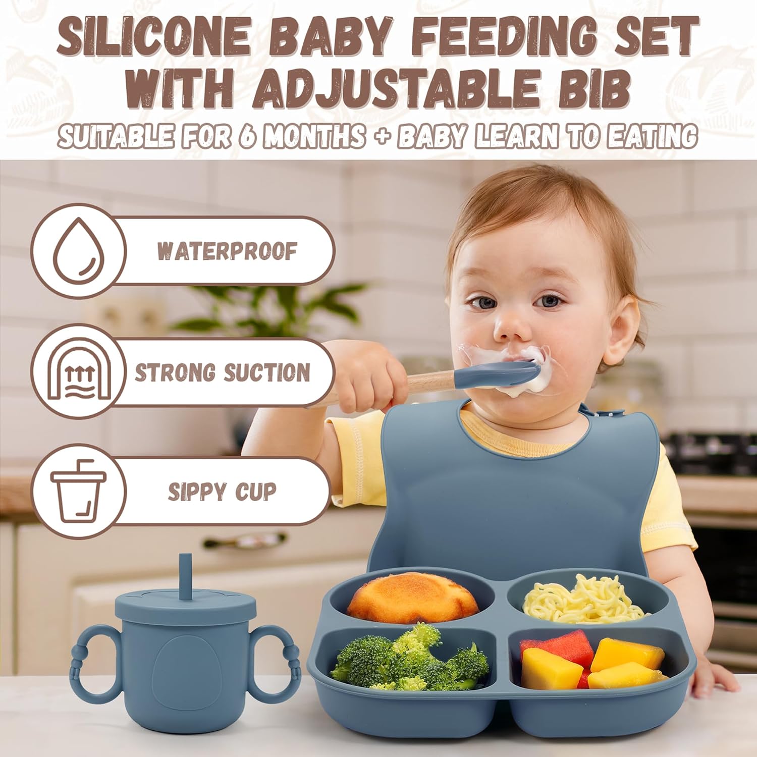 Terrific Coaching Tableware: Assist child learn to eat and drink with out assist. Our child consuming set contains one suction plate, one suction bowl, one adjustable silicone bib, one ingesting cup with straw and lid, one spoon, one fork and one complementary meals cake mildew. Excellent for child led weaning, this set offers a protected and handy answer for feeding infants 6-12 months+