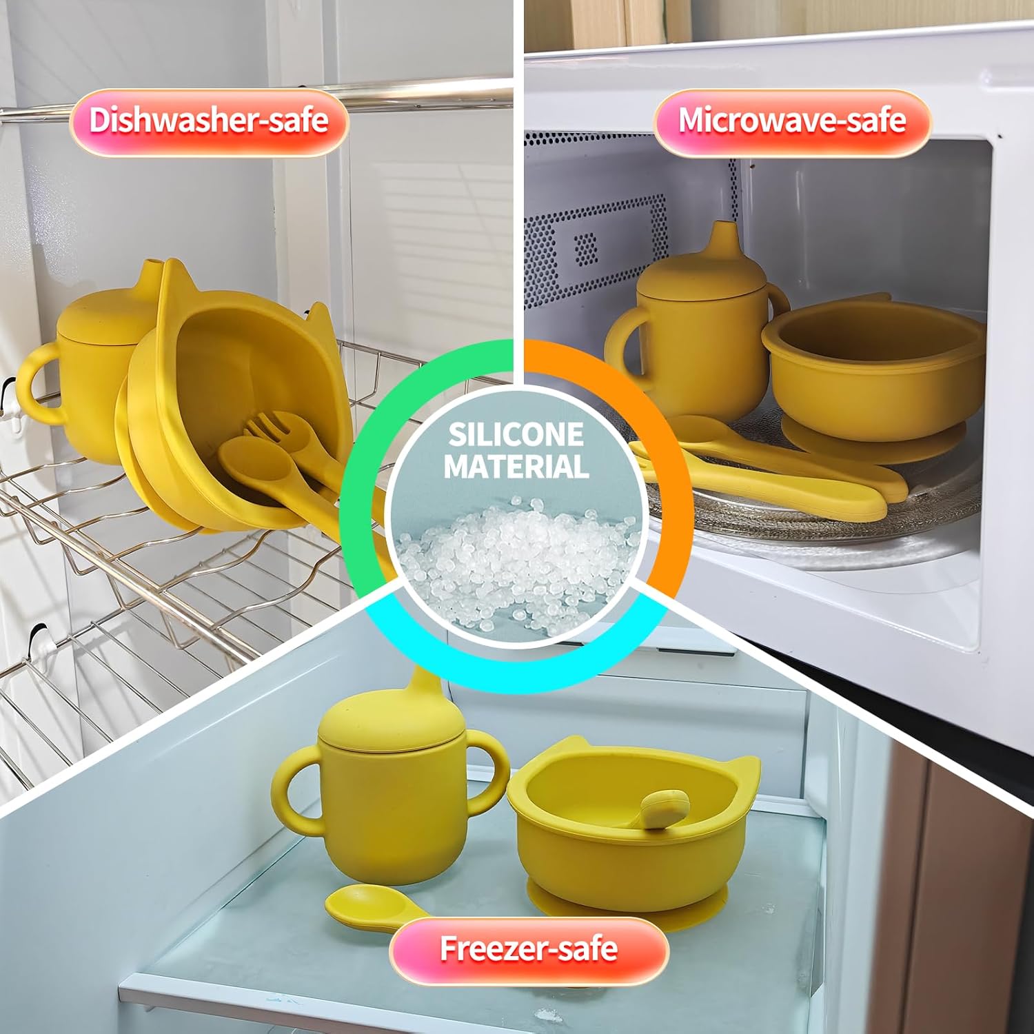 【THOUGHTFUL COMBO SET】 – Every set contains 1 bowl, 1 water cup, 1 spoon and 1 fork, the silicone cutlery set is designed to be drop-proof, so you do not have to fret about breaking it even in case you by accident drop it.