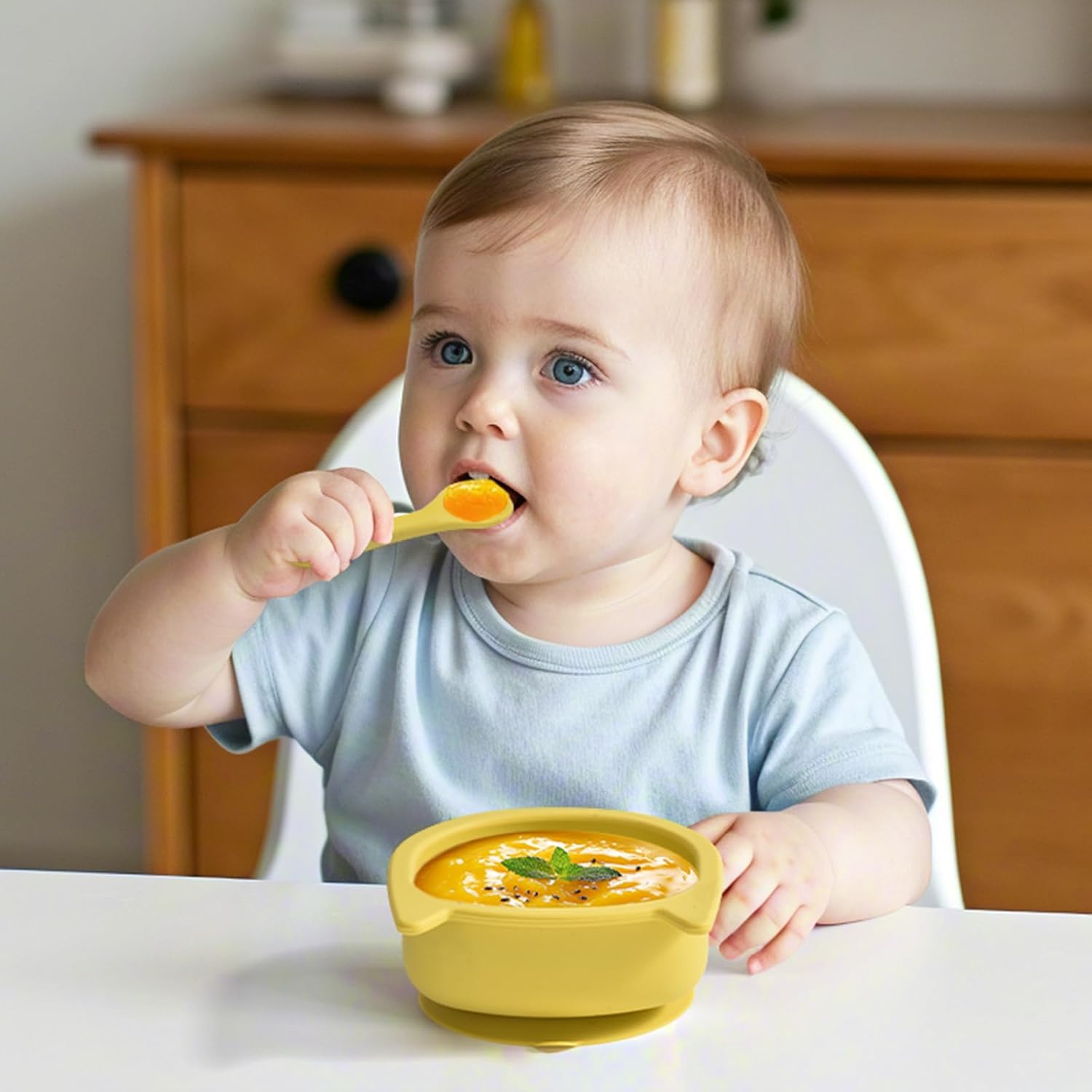 【100% FOOD GRADE SILICONE】– This feeding set is fabricated from meals grade silicone, the ingesting floor of the silicone water cup is clean, the sturdy silicone cutlery is gentle to the touch, straightforward to carry and feed, gentle and sturdy to make sure protected use.