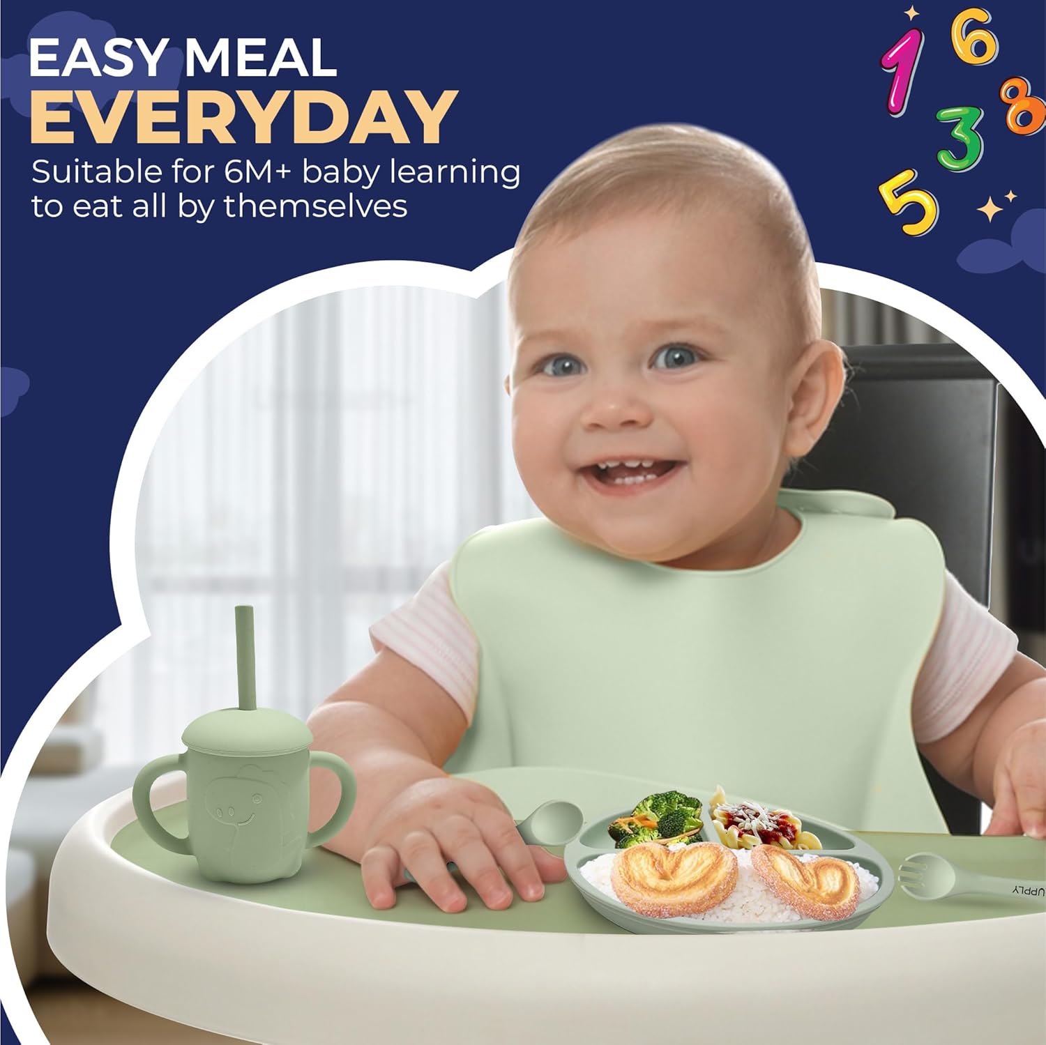 SilliSupply Silicone Baby Feeding Set with Utensil Holders & Catch Compartment – Innovative Weaning Kit with Bib, Spoon, and Suction Mat