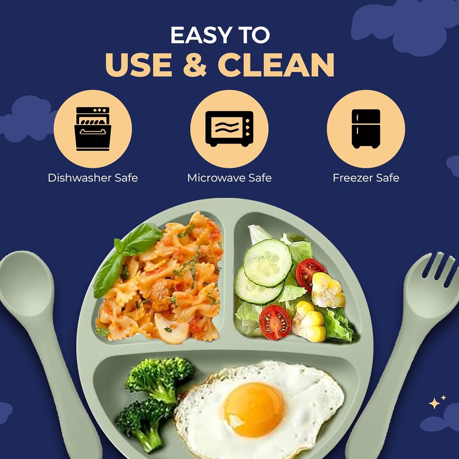 Progressive Feed-Catching & Utensil Holder Design: Includes a silicone mat outfitted with a feed-catching compartment and built-in holders for spoons and forks, stopping utensils from touching the ground and holding mealtime tidy.