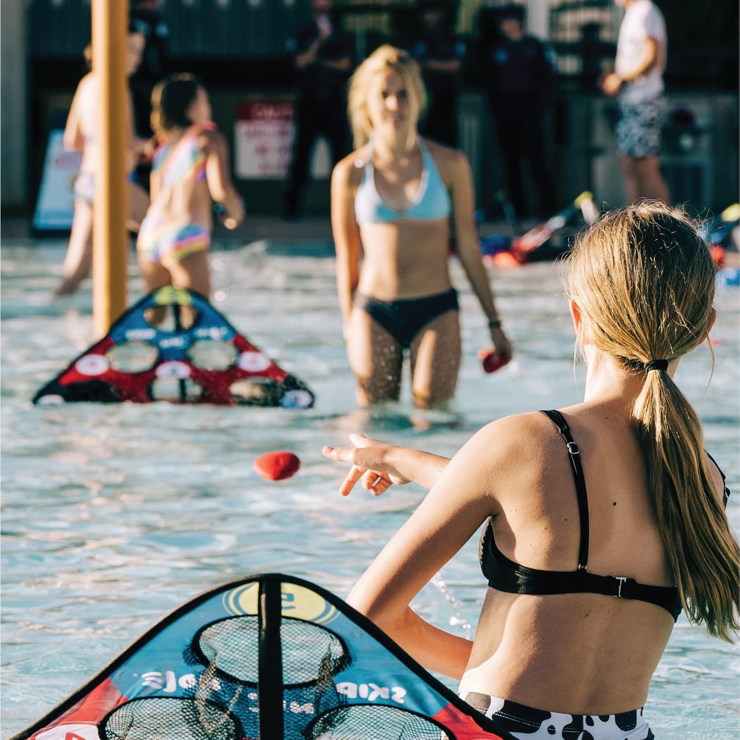FLOATING SKIPPING STONE POOL TOY: Stone skipping meets taking part in cross or water cornhole SCORE NN’ HOLE targets NOT included. Play with your loved ones and associates.