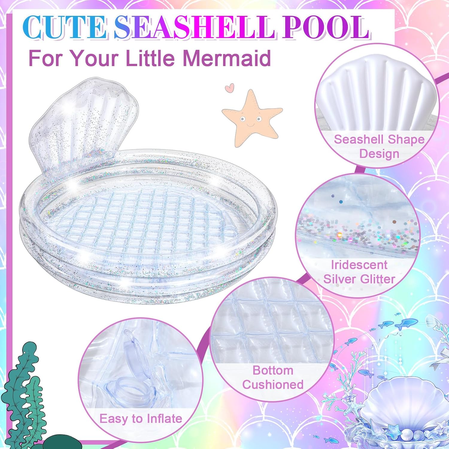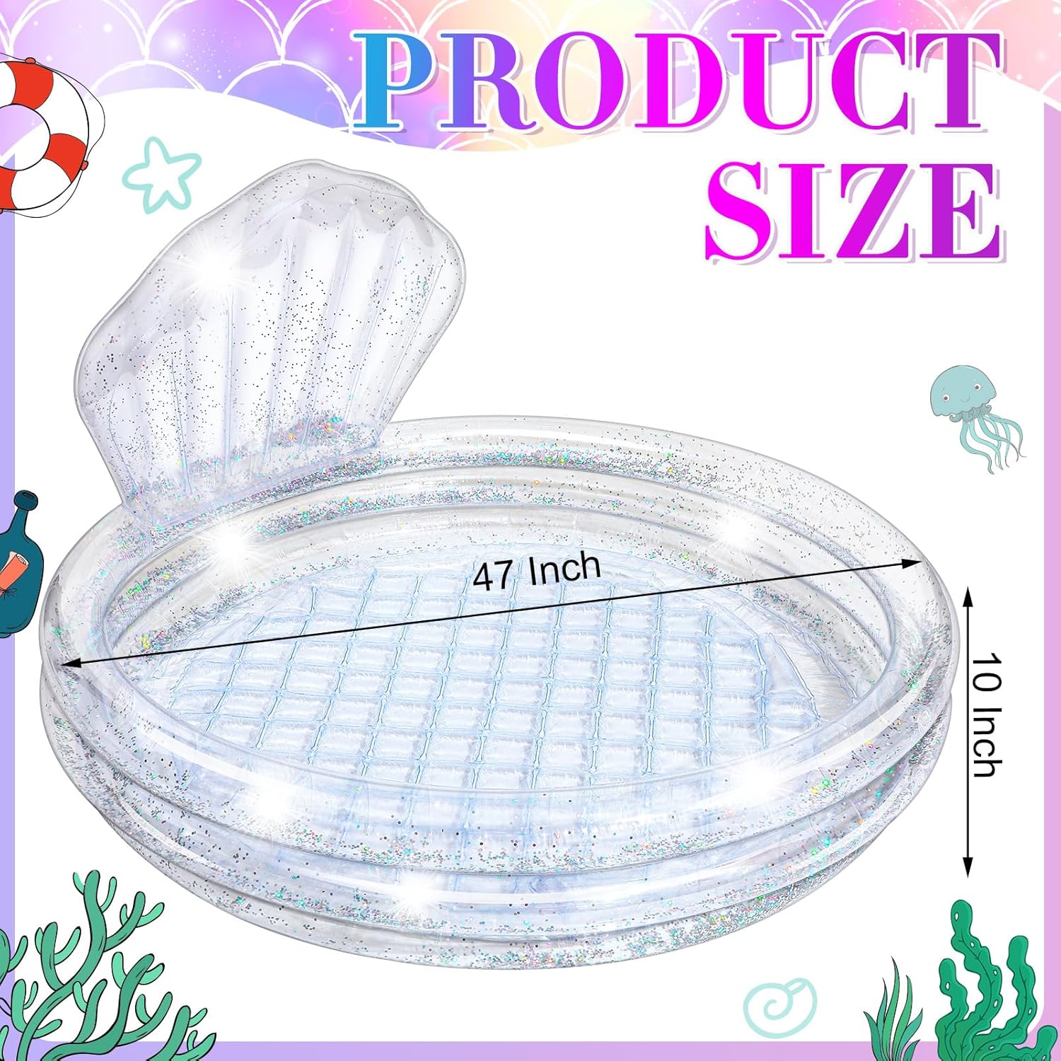 Mermaid Seashell Pool Float: sparkle seashell kiddie pool options cute seashell white shell and clear glitter ornament, deliver dreamy sea vibes; The inflatable kiddie pool is a fascinating manner so as to add countless hours of enjoyable and pleasure to your infant’s summer time adventures