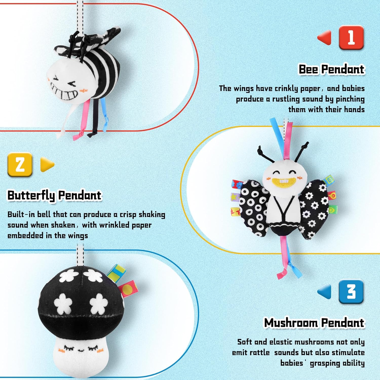 Multi-Sensory Hanging Toys for Interactive Play – Consists of 3 removable sensory toys: crinkle-wing bee (with squeaker), jingling butterfly (with bells and crinkle paper), and rattle mushroom. Every toy promotes auditory, tactile, and hand-eye coordination improvement by means of diversified textures, sounds, and actions.
