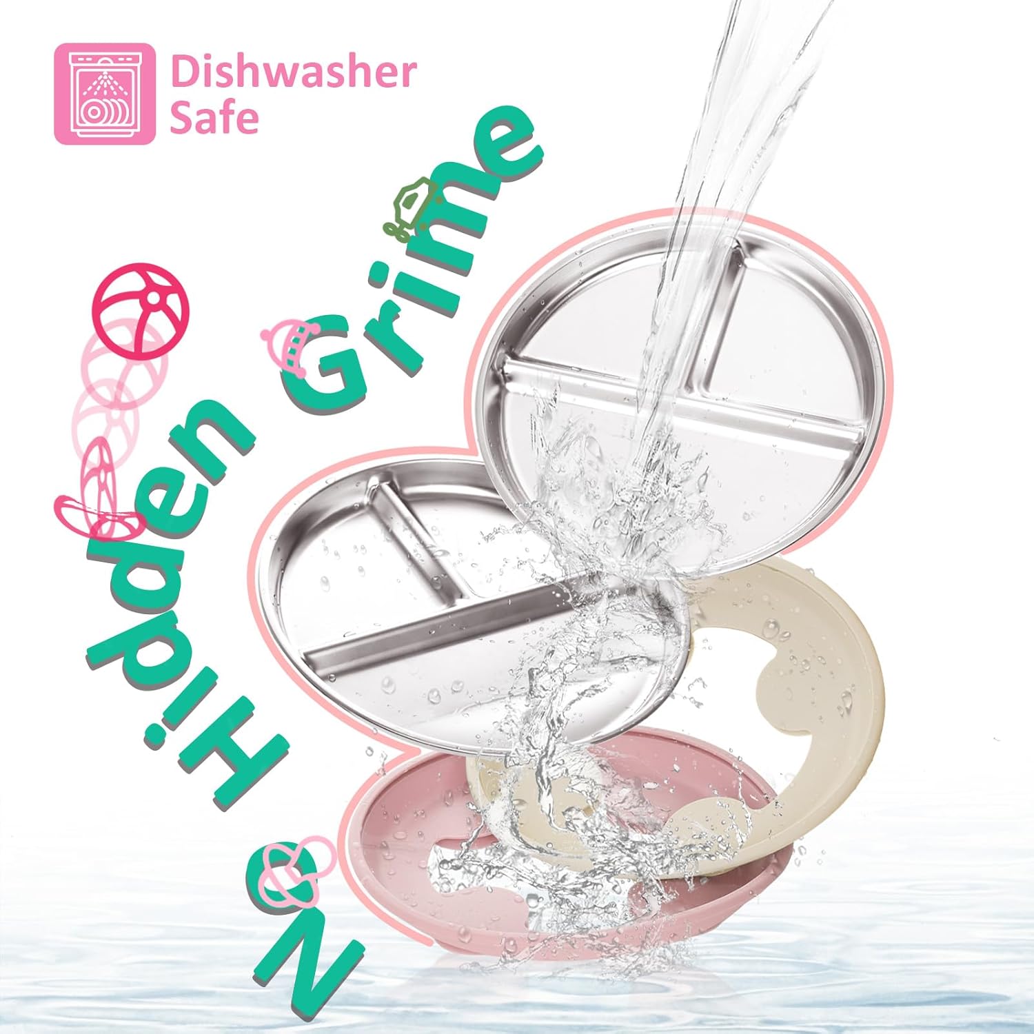 Revolutionary Design: This child plate with suction combines sturdy 304 chrome steel with a silicone suction base that includes 4 robust, non-slip suction cups. Retains plates in place on highchair trays or tables, serving to your youngster self-feed and minimizing mealtime mess. Say goodbye to flipped toddler plates and whats up to free fingers for mother!
