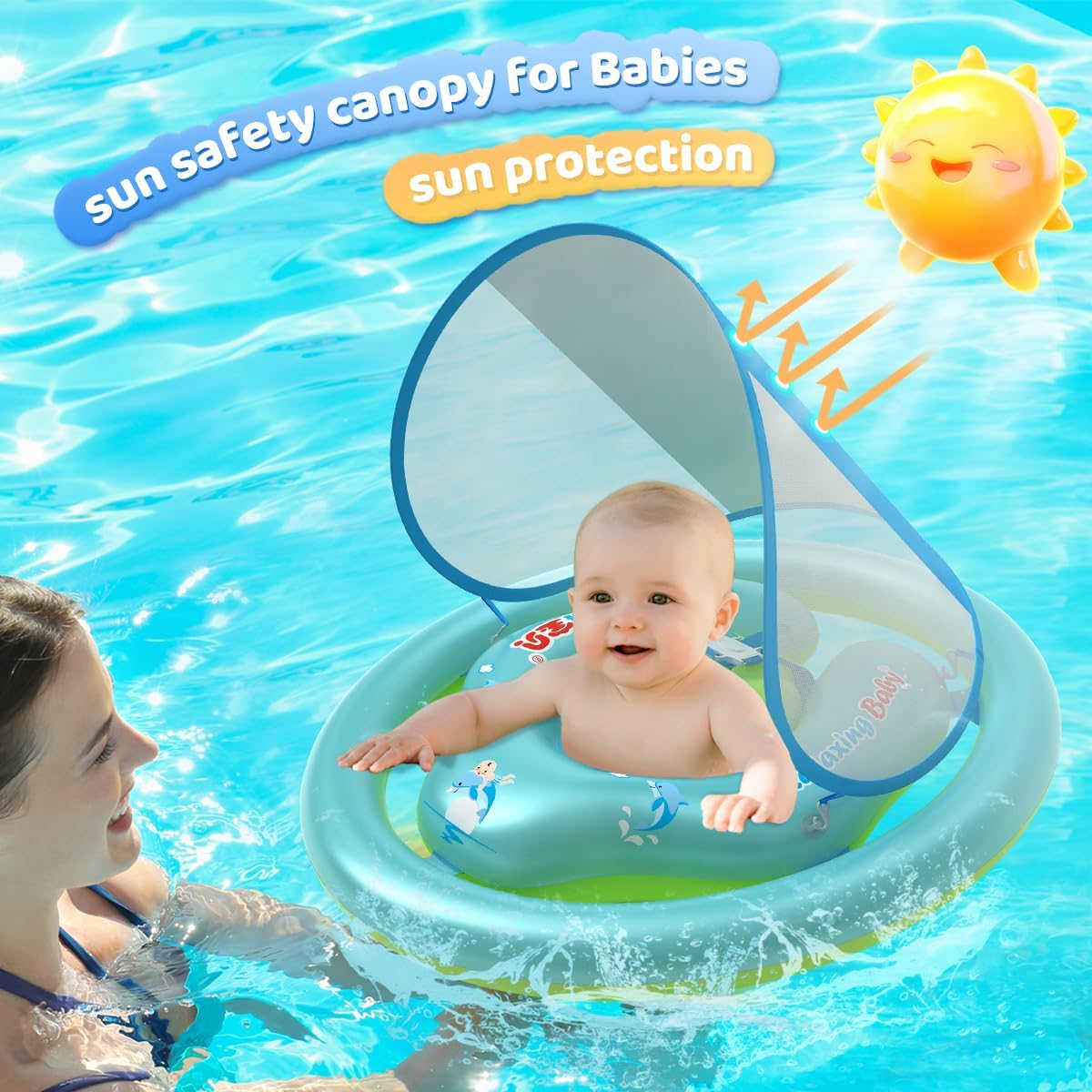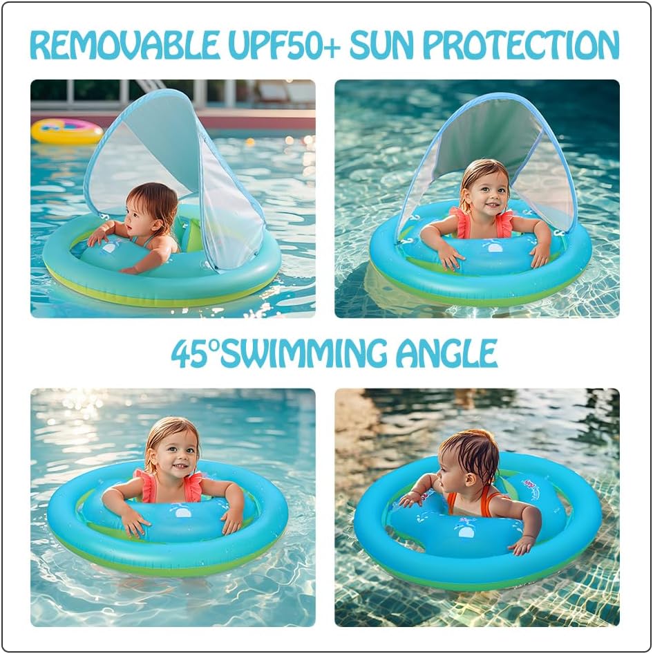【UPF 50+ Solar Safety】 Detachable/adjustable child pool float with cover offers solar safety for child’s pores and skin in all instructions.