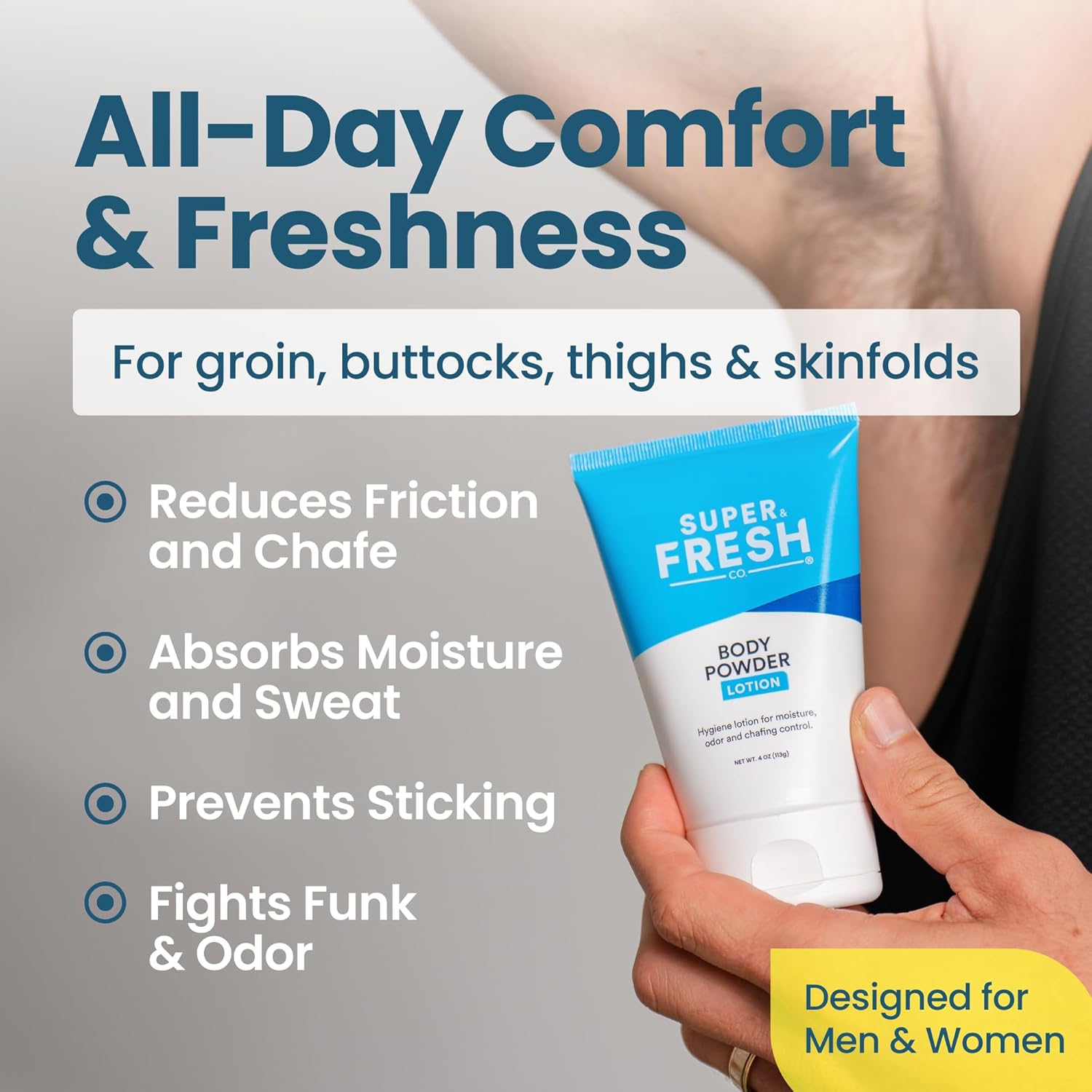 STOP ODOR AND DISCOMFORT | A bit of goes a great distance. Apply Tremendous Recent Physique Powder Lotion totally, let it dry (essential), then dress. Dries quick to a easy powdery end. Nice for combating jock itch, pinching, stickiness, odor and absorbing gentle sweat.