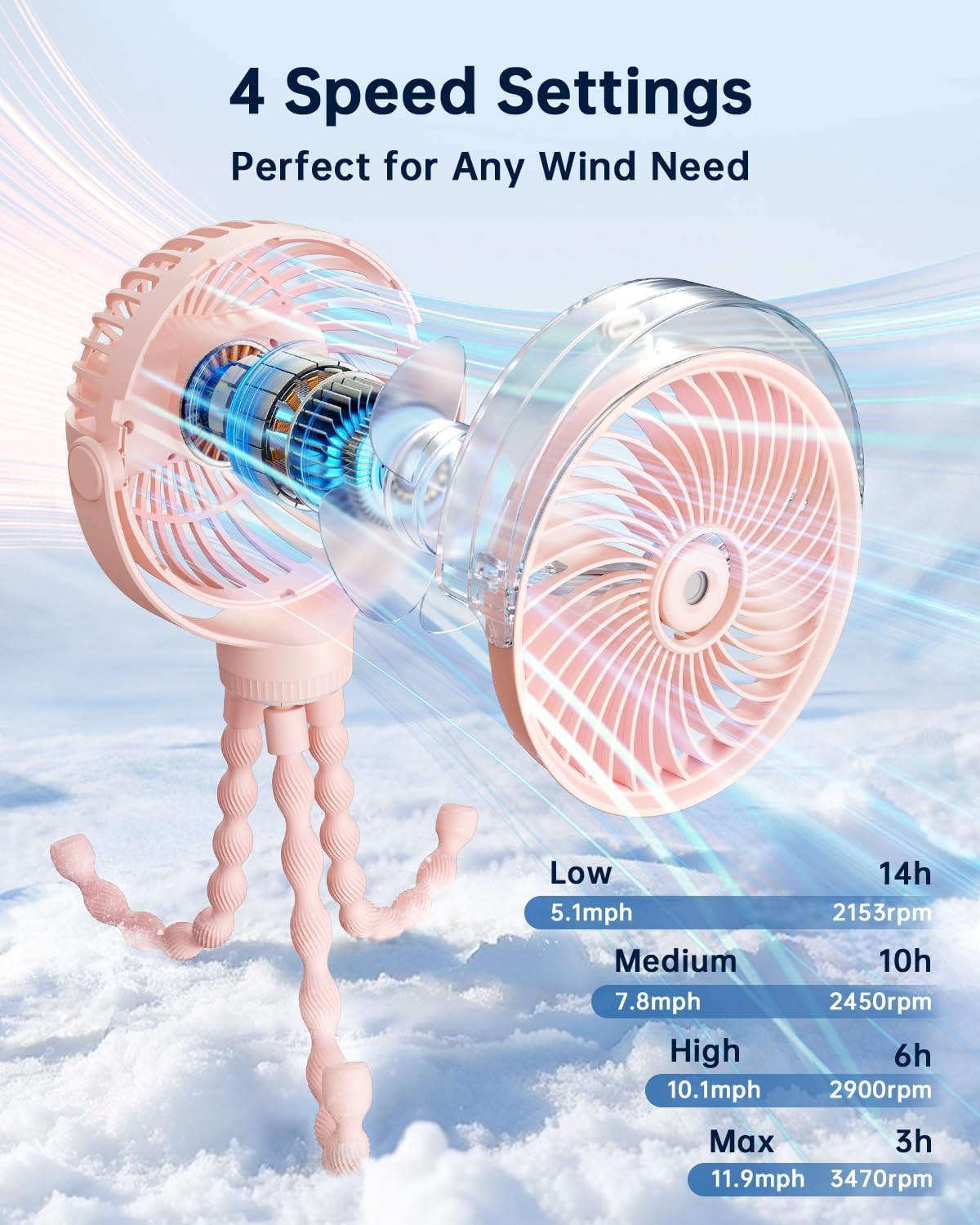 4-Velocity Wind & All-Day Battery: Select from 4 wind speeds (5.1–11.9 mph) to match any temperature. The 3000mAh battery powers the fan for 3 to 14 hours, making it an excellent rechargeable fan for journey, stroller, or automotive seat use