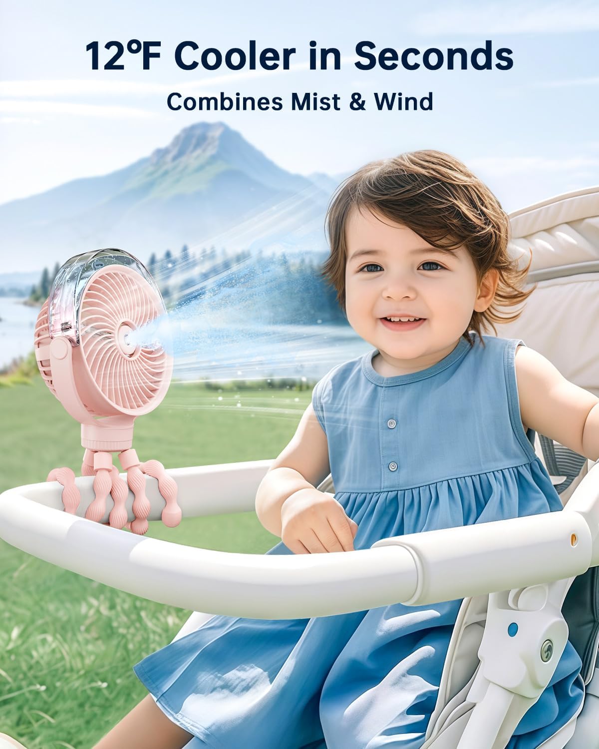 Mist + Wind Combo for Quick Cooling: This upgraded stroller fan combines ultra-fine mist and highly effective airflow, boosting cooling effectivity by as much as 120%. Mist and fan can work collectively or individually, with twin mist modes (steady/intermittent) for out of doors walks or summer time journey