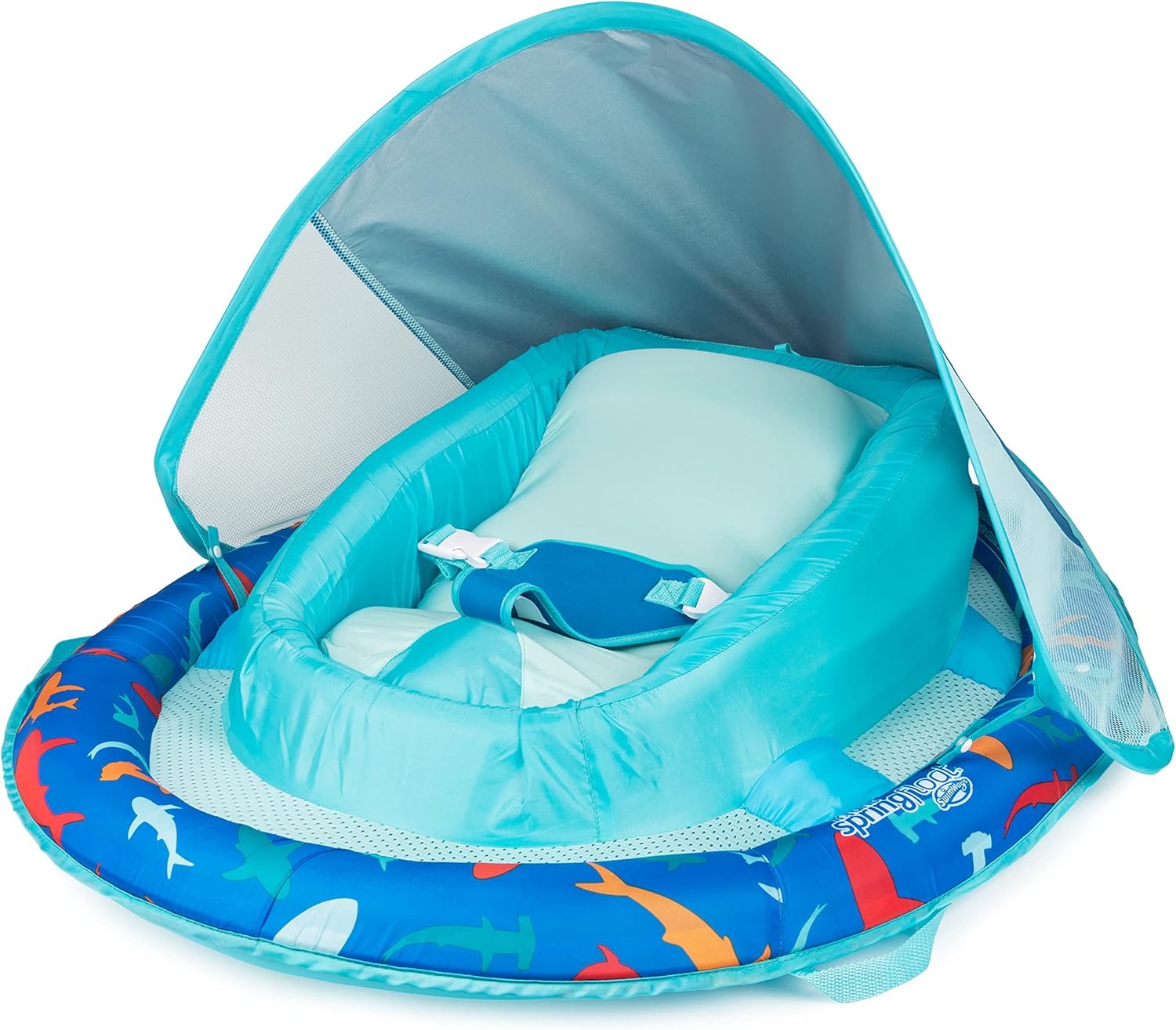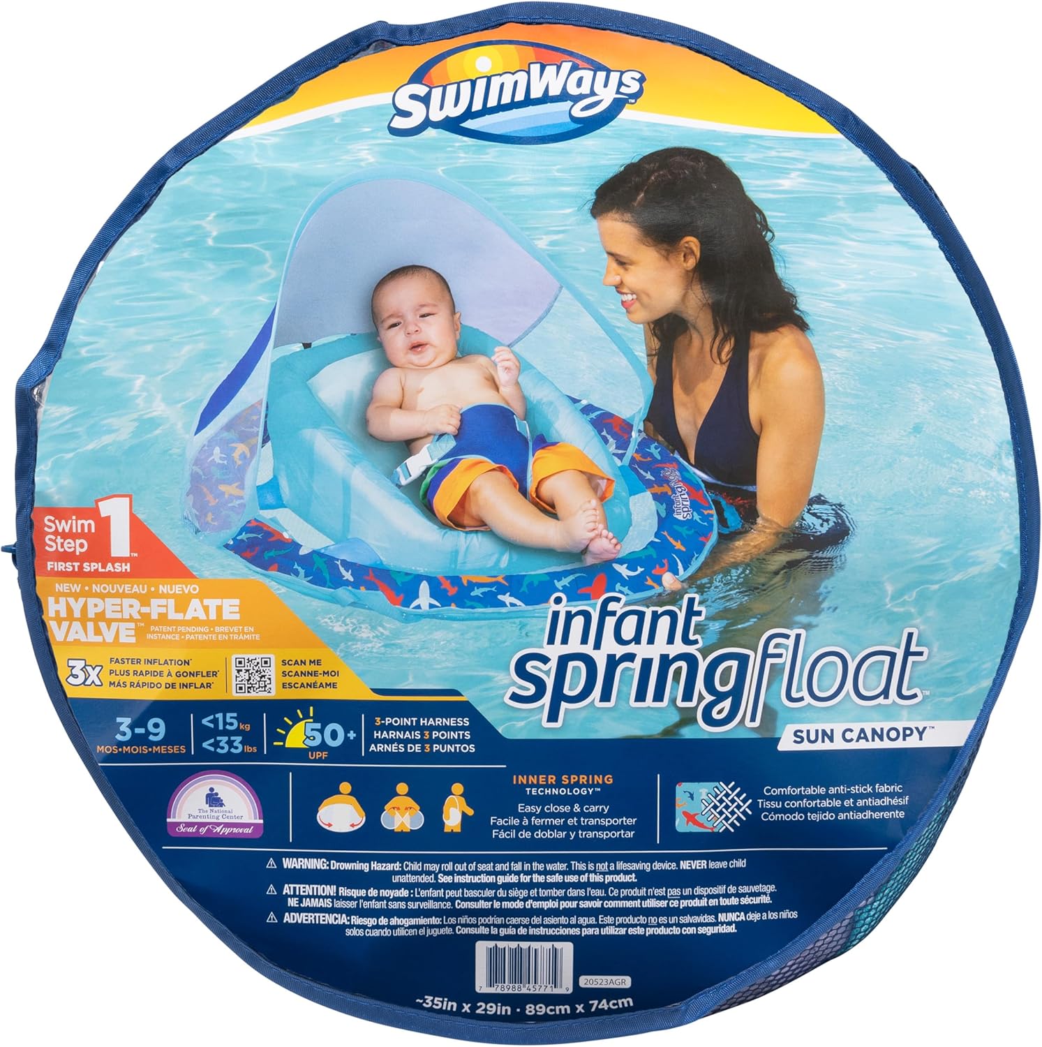 The SwimWays Toddler Child Spring Float with Solar Cover is a fabric-covered child float for ages 3 months till child makes an attempt to climb out or sit up (roughly 9 months). This toddler float contains a delicate seat with an adjustable 3-point harness to maintain child safe. Further options embrace dual-inflation chambers, security valves, a large base with an inside spring across the outdoors fringe of the float for stability, and a detachable/adjustable solar cover with UPF 50+ solar safety. Constructed-in handles make it simple for mother or dad to carry the float securely always. Folds flat into 3 compact rings for portability and storage. Carry case included.