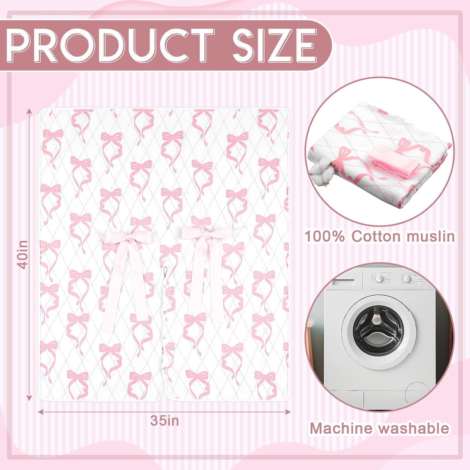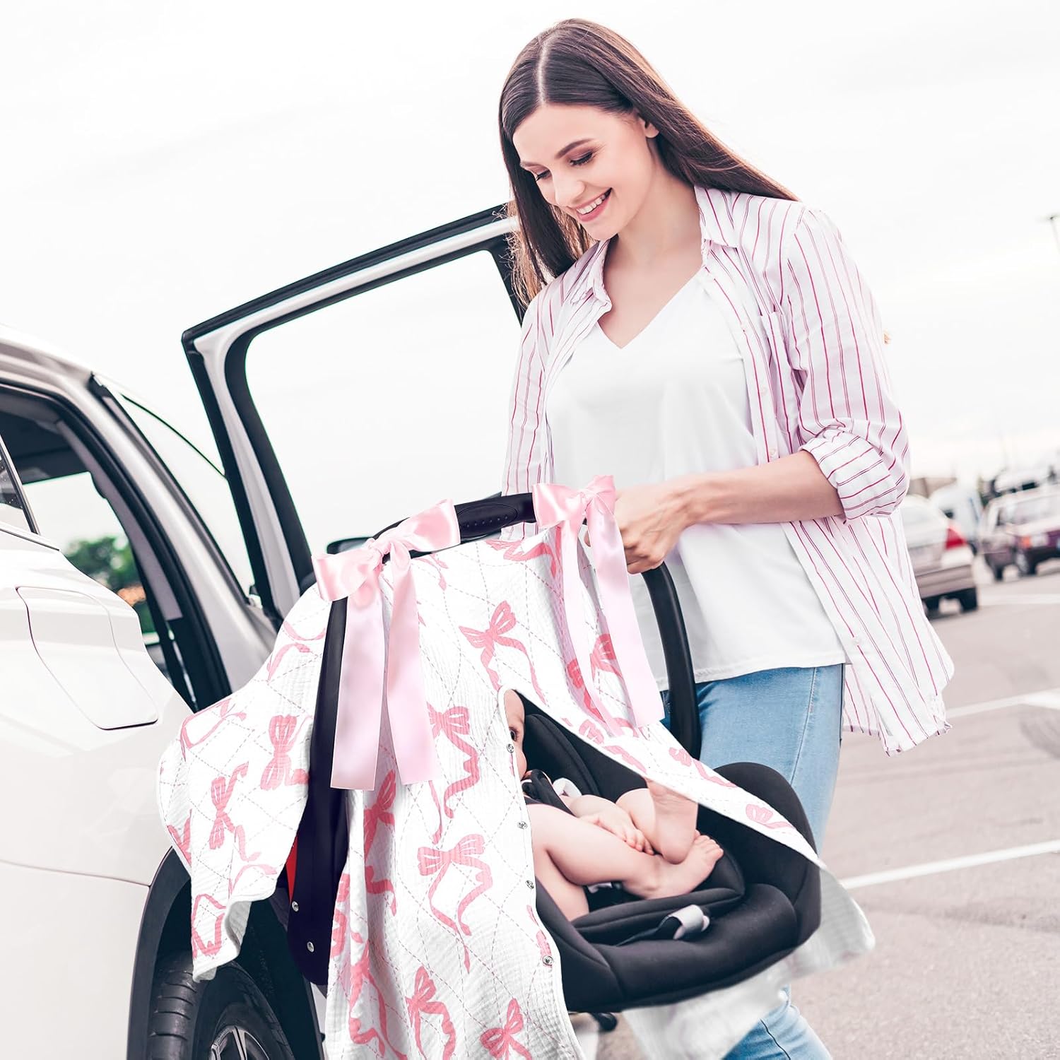 Tegeme 2-in-1 Pink Bow Muslin Baby Car Seat Cover Breathable Multi-use Nursing Infant Car Seat Cover Windproof Canopy for Breastfeeding Strollers Carriers
