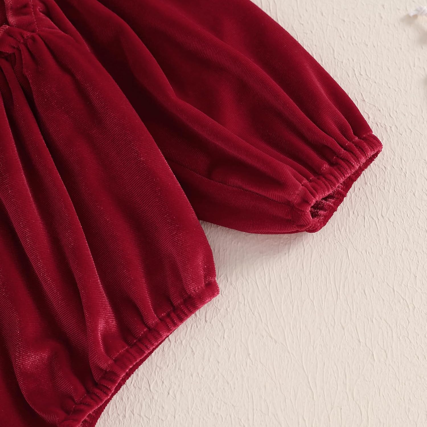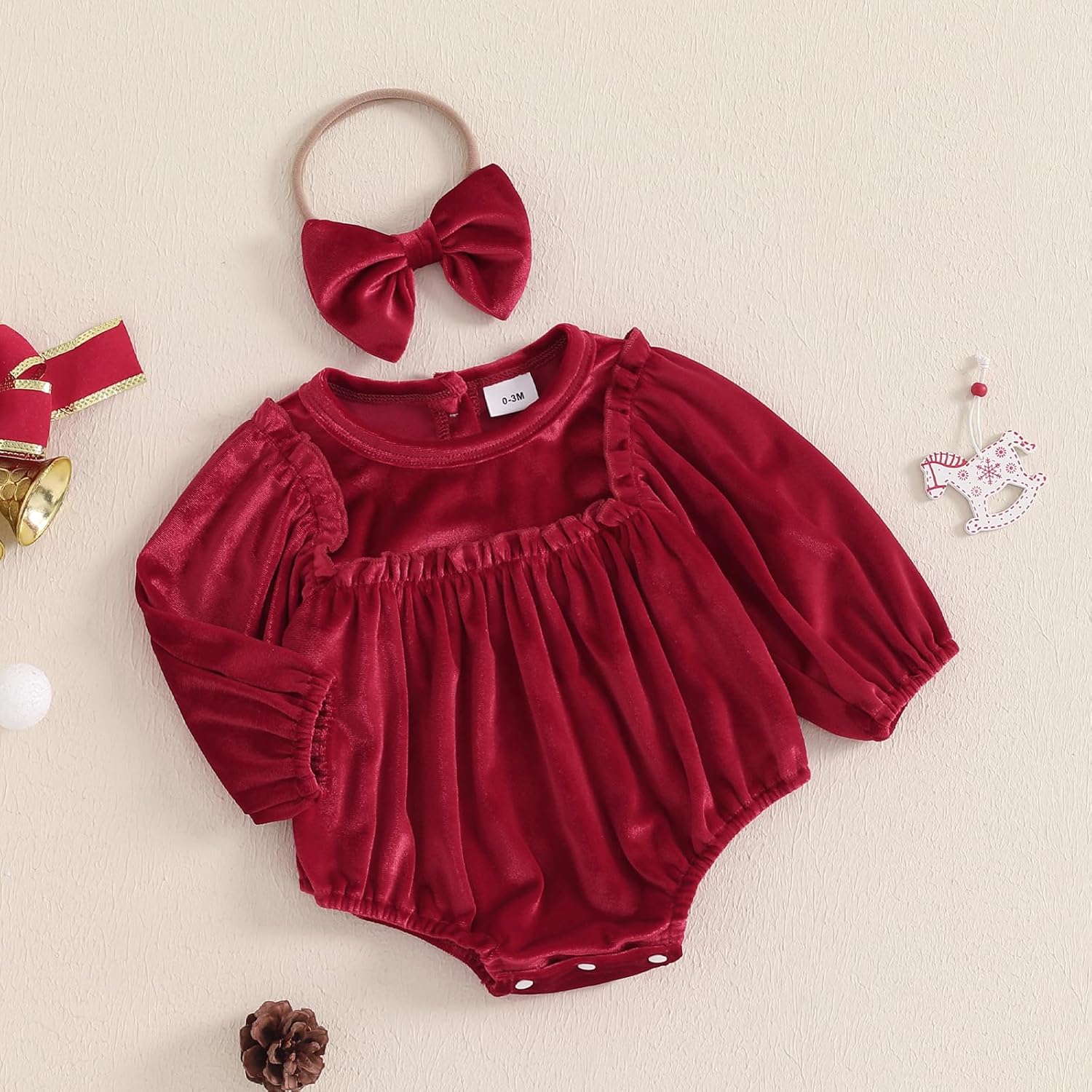 My first christmas garments for child women Pink christmas romper Bow headbandPleated design romperVelvet materialBotton closure bodysuitElastic lengthy sleeve romperChristmas present for child women