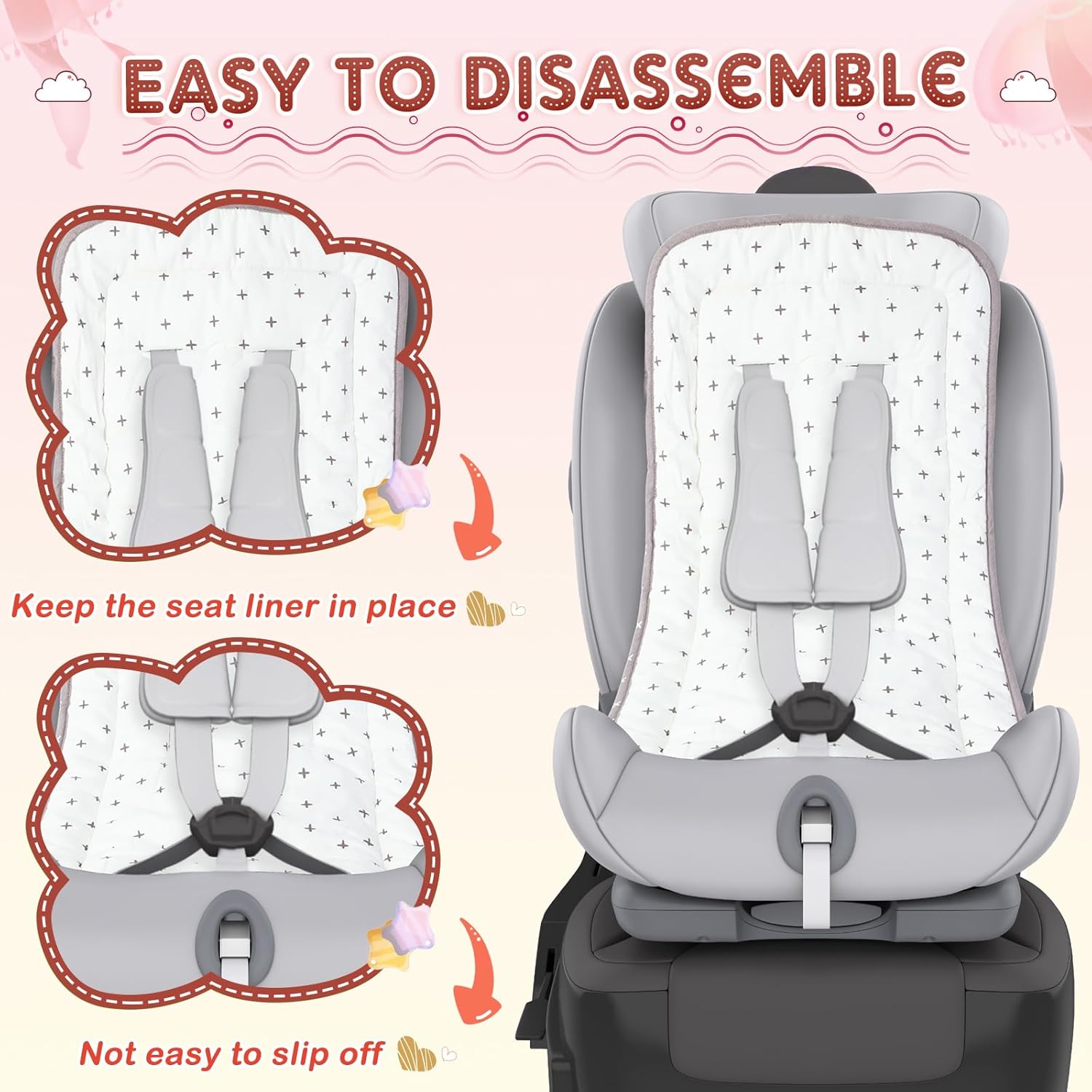 Adjustable Design: the automotive seat liner comes with 9 slip holes for belt and buckle which lets you modify the liners in accordance with the scale of your stroller; This ensures that the liner matches nicely and prevents slipping and sliding