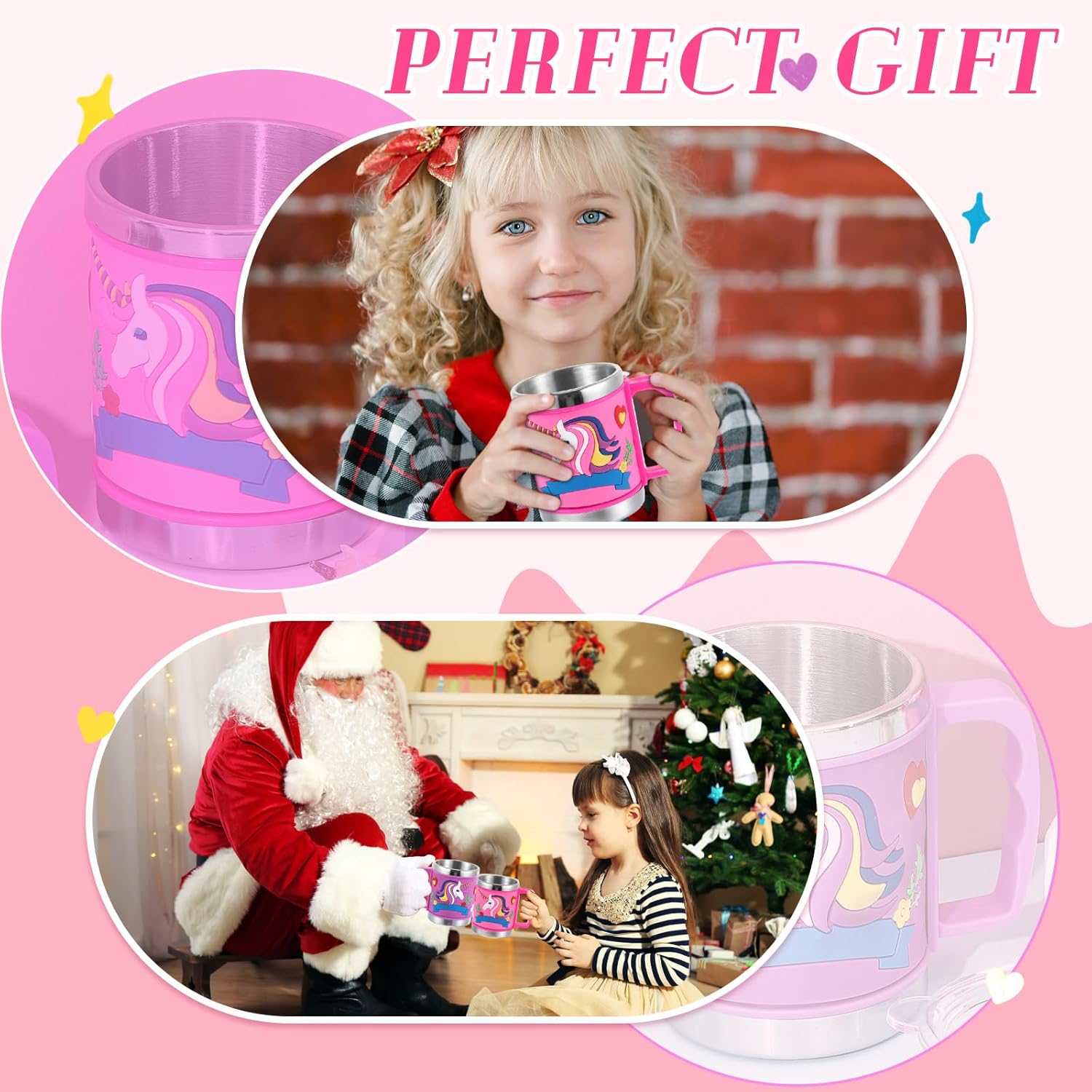 The stainless-steel cups with Handles are designed with cute unicorn patterns in vibrant purple and pink colours, making it visually interesting to kids.