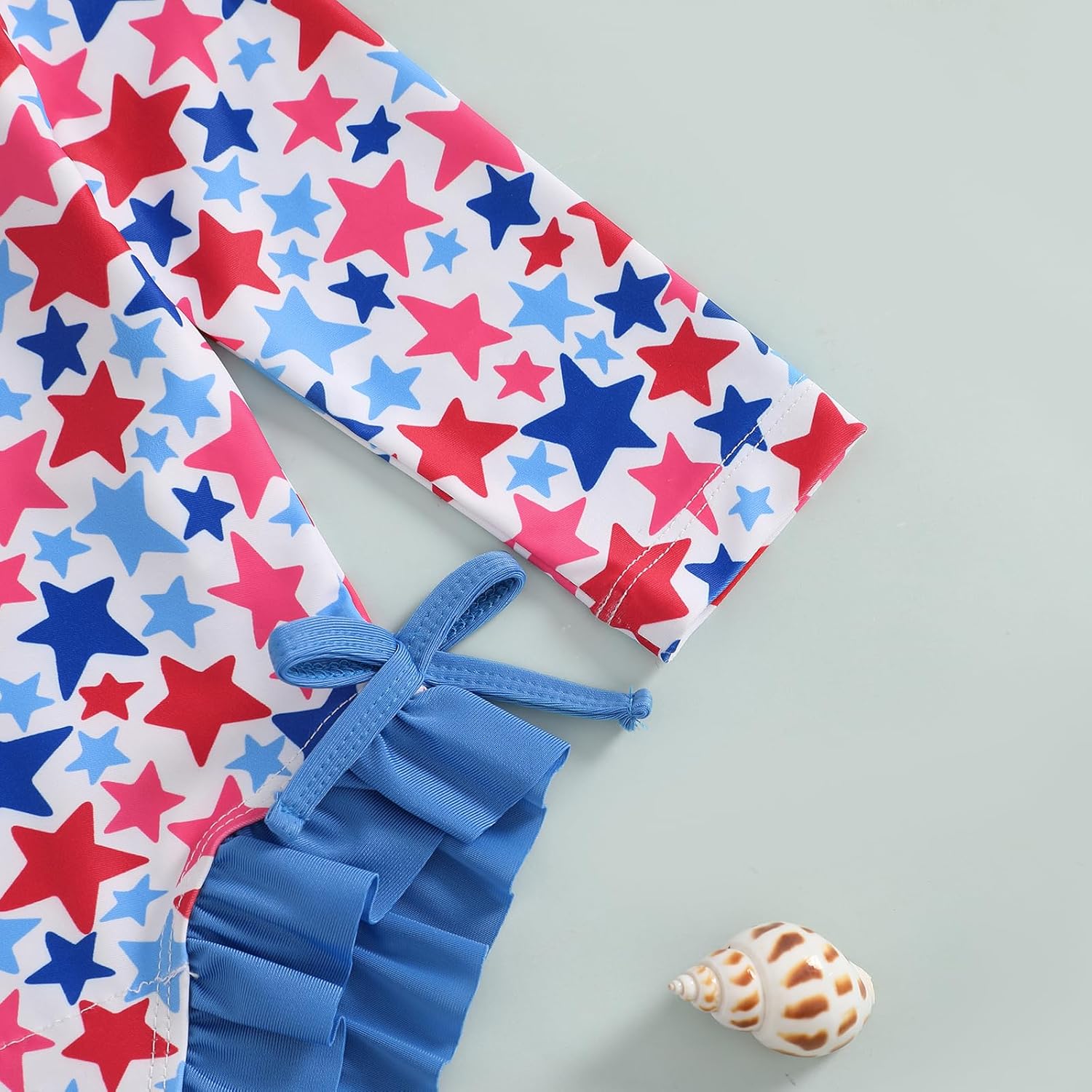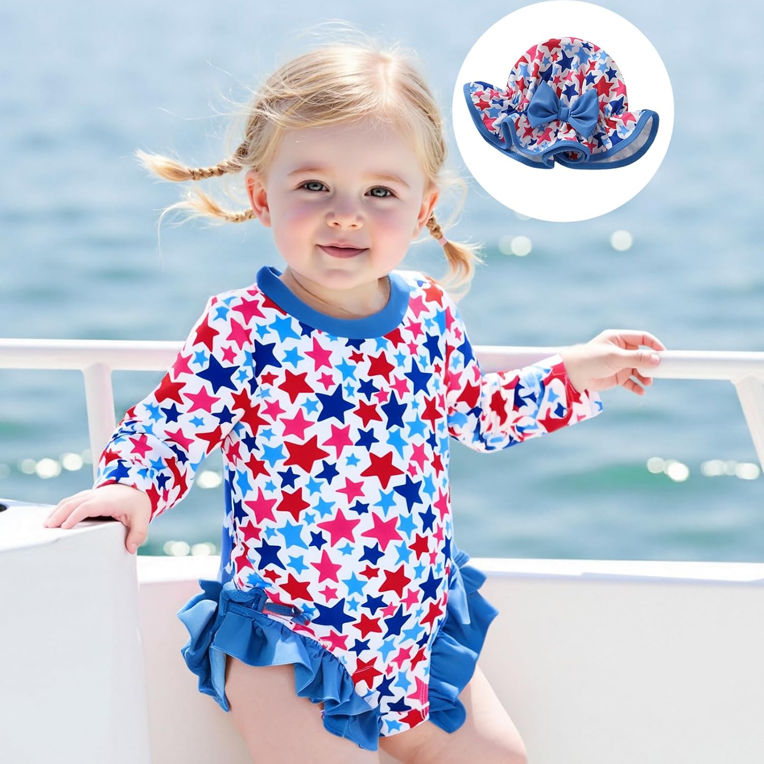 Toddler Baby Girl One-Piece Rash Guard Swimsuit 4th of July Swimwear Long Sleeve Zipper Ruffle Bathing Suit with Hat