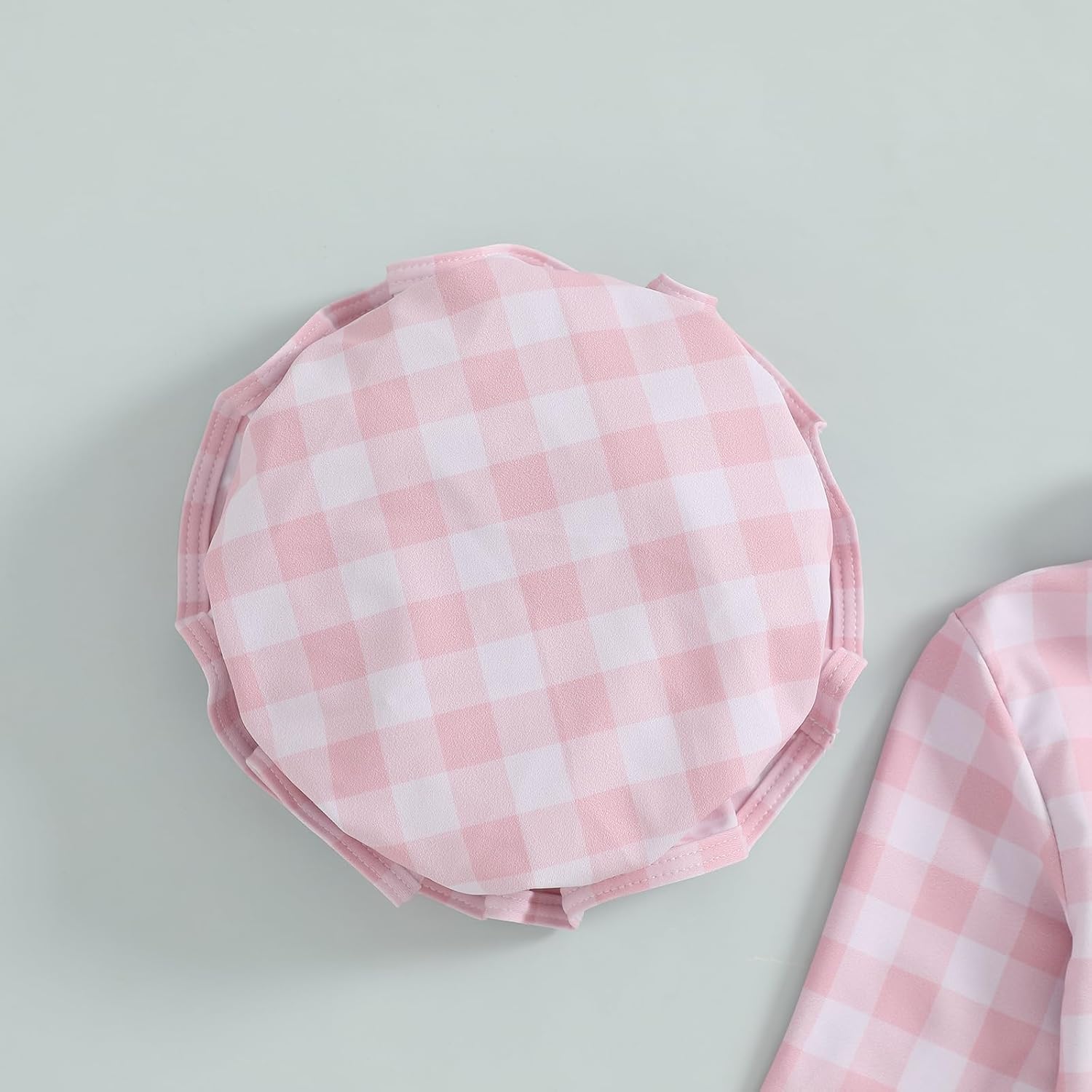 Toddler Baby Girl One Piece Swimsuit Checkered Print Long Sleeve One Piece Rash Guard Ruffle Swimsuit with Hat Set