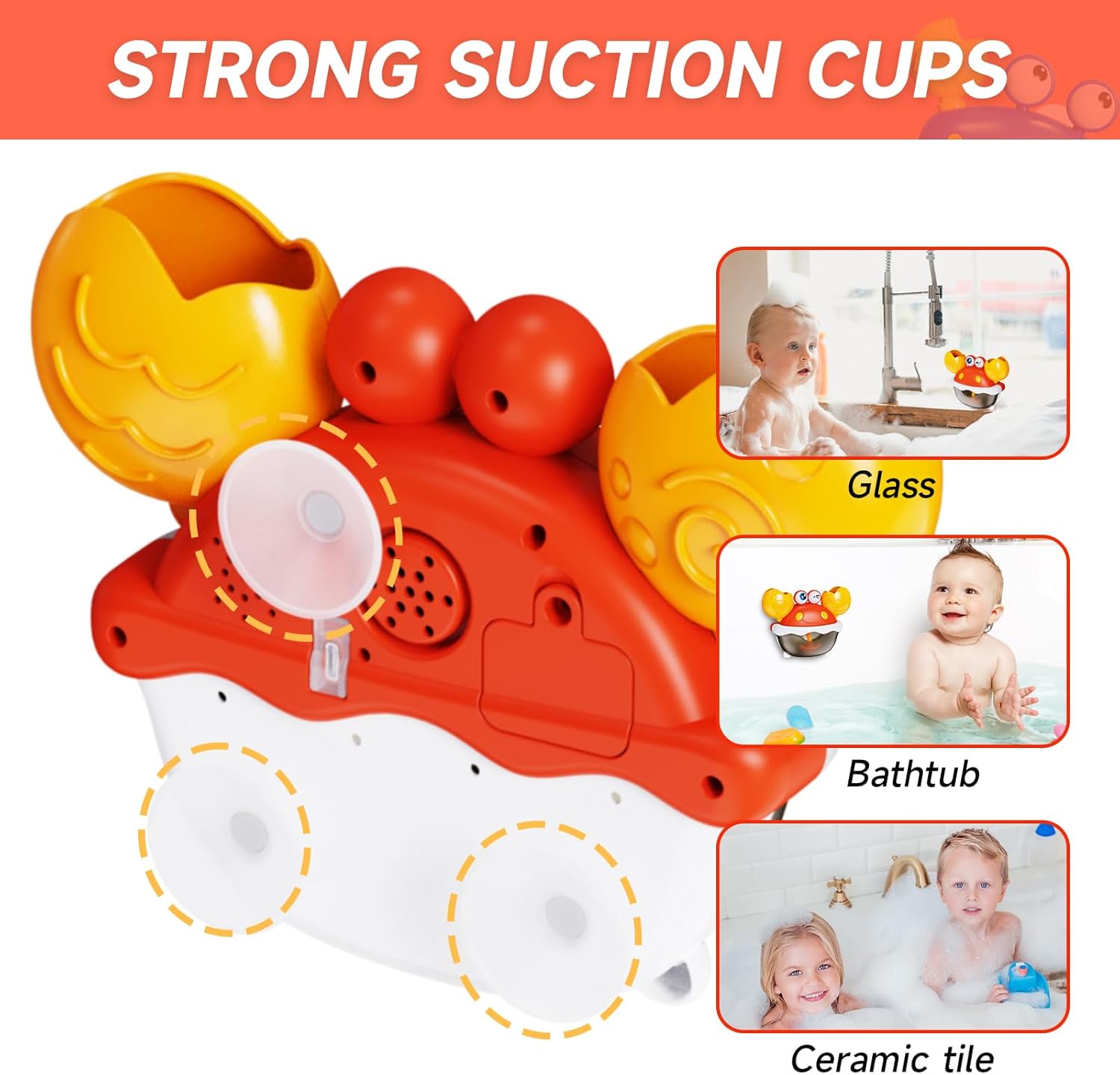 【Robust Suction Cups】The Bubble Crab has 3 robust suction cups that securely connect to the bath or any rest room floor. You may spray some water to make the suction cups stick steadily and firmly. Your child can benefit from the bubble bathtub to the fullest.