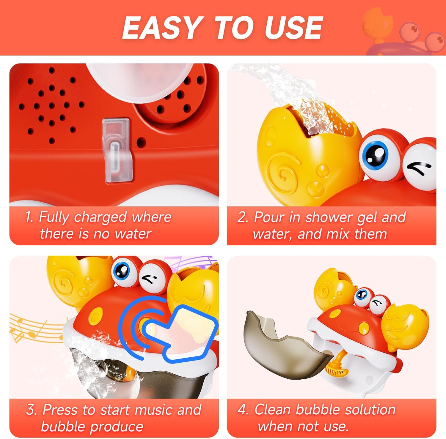 【Rechargeable Crab Bubble Machine】The kids’s bathtub toys have built-in rechargeable batteries, no want to switch batteries continuously. Join the charger and use it for a very long time after totally charged, take pleasure in a long-lasting bathing expertise in your child.There’s glorious water resistance, however you can’t submerge the bubble machine in water.